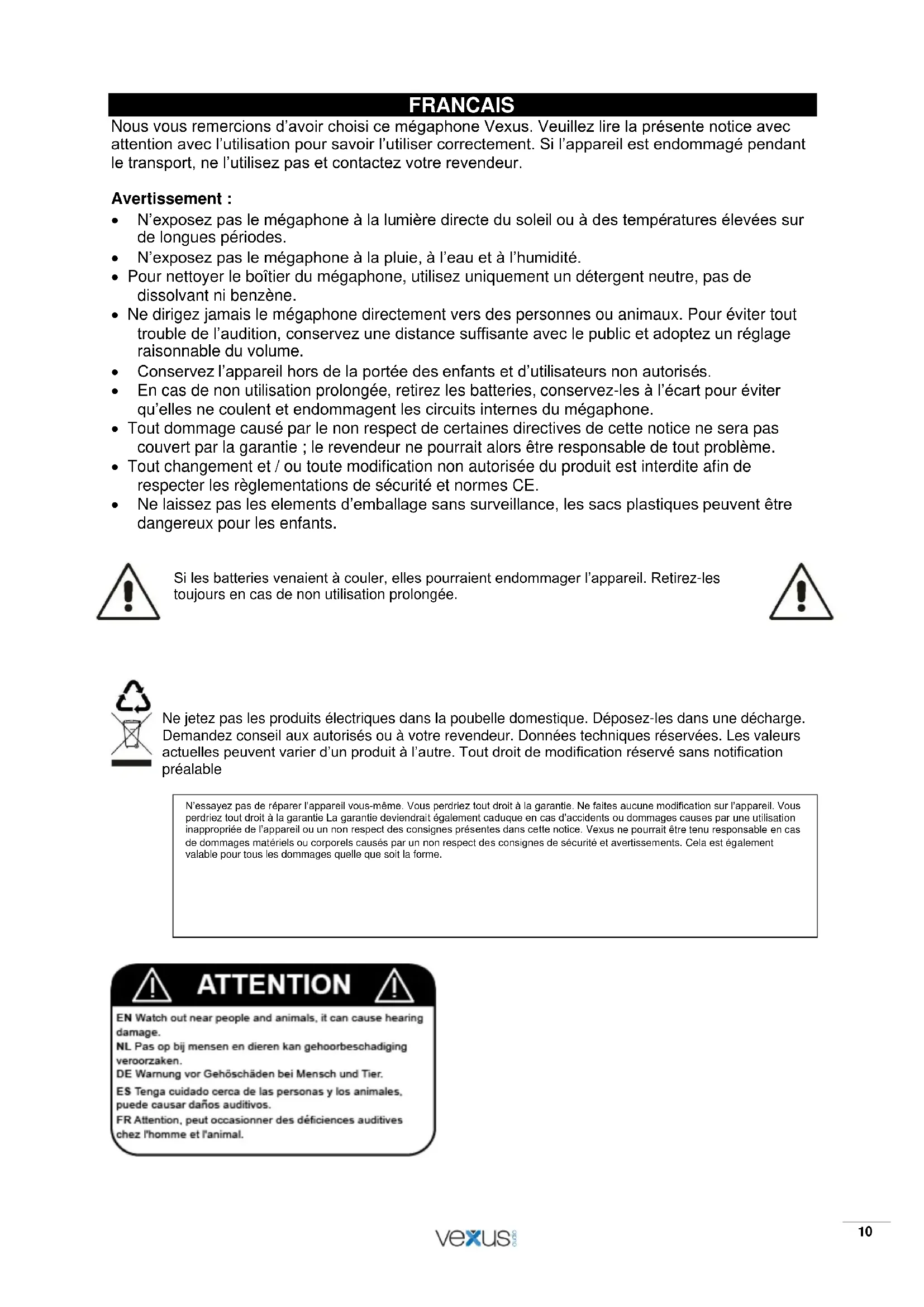 N’exposez pas le mégaphone à la lumière directe du soleil ou à des températures élevées sur de longues périodes. N’exposez pas le mégaphone à la pluie, à l’eau et à l’humidité. Pour nettoyer le boîtier du mégaphone, utilisez uniquement un détergent neutre, pas de dissolvant ni benzène. Ne dirigez jamais le mégaphone directement vers des personnes ou animaux. Pour éviter tout trouble de l’audition, conservez une distance suffisante avec le public et adoptez un réglage raisonnable du volume. Conservez l’appareil hors de la portée des enfants et d’utilisateurs non autorisés. En cas de non utilisation prolongée, retirez les batteries, conservez-les à l’écart pour éviter qu’elles ne coulent et endommagent les circuits internes du mégaphone. Tout dommage causé par le non respect de certaines directives de cette notice ne sera pas couvert par la garantie ; le revendeur ne pourrait alors être responsable de tout problème. Tout changement et / ou toute modification non autorisée du produit est interdite afin de respecter les règlementations de sécurité et normes CE. Ne laissez pas les elements d’emballage sans surveillance, les sacs plastiques peuvent être dangereux pour les enfants.