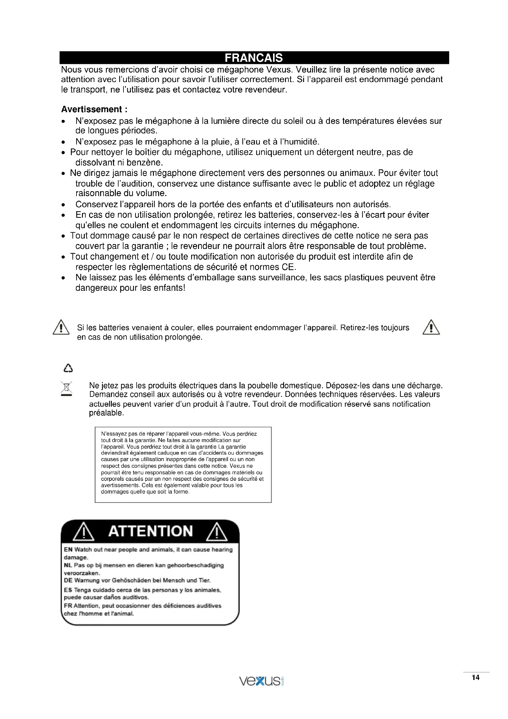 N’exposez pas le mégaphone à la lumière directe du soleil ou à des températures élevées sur de longues périodes. N’exposez pas le mégaphone à la pluie, à l’eau et à l’humidité. Pour nettoyer le boîtier du mégaphone, utilisez uniquement un détergent neutre, pas de dissolvant ni benzène. Ne dirigez jamais le mégaphone directement vers des personnes ou animaux. Pour éviter tout trouble de l’audition, conservez une distance suffisante avec le public et adoptez un réglage raisonnable du volume. Conservez l’appareil hors de la portée des enfants et d’utilisateurs non autorisés. En cas de non utilisation prolongée, retirez les batteries, conservez-les à l’écart pour éviter qu’elles ne coulent et endommagent les circuits internes du mégaphone. Tout dommage causé par le non respect de certaines directives de cette notice ne sera pas couvert par la garantie ; le revendeur ne pourrait alors être responsable de tout problème. Tout changement et / ou toute modification non autorisée du produit est interdite afin de respecter les règlementations de sécurité et normes CE. Ne laissez pas les éléments d’emballage sans surveillance, les sacs plastiques peuvent être dangereux pour les enfants!