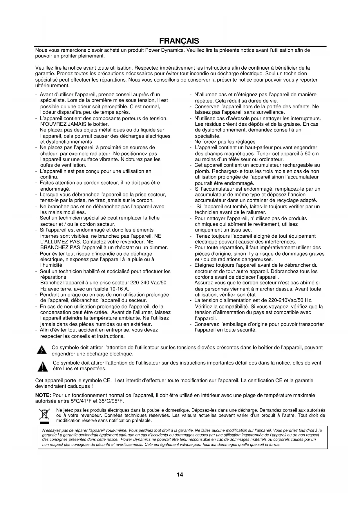 Muestra la señal de salida. NOTA: El segmento "0" corresponde al nivel nominal de salida. El indicador de pico se ilumina en rojo cuando la salida alcanza el nivel de recorte.14 FRANÇAIS Nous vous remercions d’avoir acheté un produit Power Dynamics. Veuillez lire la présente notice avant l’utilisation afin de pouvoir en profiter pleinement. Veuillez lire la notice avant toute utilisation. Respectez impérativement les instructions afin de continuer à bénéficier de la garantie. Prenez toutes les précautions nécessaires pour éviter tout incendie ou décharge électrique. Seul un technicien spécialisé peut effectuer les réparations. Nous vous conseillons de conserver la présente notice pour pouvoir vous y reporter ultérieurement. - Avant d’utiliser l’appareil, prenez conseil auprès d’un spécialiste. Lors de la première mise sous tension, il est possible qu’une odeur soit perceptible. C’est normal, l’odeur disparaîtra peu de temps après. - L’appareil contient des composants porteurs de tension. N’OUVREZ JAMAIS le boîtier. - Ne placez pas des objets métalliques ou du liquide sur l’appareil, cela pourrait causer des décharges électriques et dysfonctionnements.. - Ne placez pas l’appareil à proximité de sources de chaleur, par exemple radiateur. Ne positionnez pas l’appareil sur une surface vibrante. N’obturez pas les ouïes de ventilation. - L’appareil n’est pas conçu pour une utilisation en continu. - Faites attention au cordon secteur, il ne doit pas être endommagé. - Lorsque vous débranchez l’appareil de la prise secteur, tenez-le par la prise, ne tirez jamais sur le cordon. - Ne branchez pas et ne débranchez pas l’appareil avec les mains mouillées. - Seul un technicien spécialisé peut remplacer la fiche secteur et / ou le cordon secteur. - Si l’appareil est endommagé et donc les éléments internes sont visibles, ne branchez pas l’appareil, NE L’ALLUMEZ PAS. Contactez votre revendeur. NE BRANCHEZ PAS l’appareil à un rhéostat ou un dimmer. - Pour éviter tout risque d’incendie ou de décharge électrique, n’exposez pas l’appareil à la pluie ou à l’humidité. - Seul un technicien habilité et spécialisé peut effectuer les réparations - Branchez l’appareil à une prise secteur 220-240 Vac/50 Hz avec terre, avec un fusible 10-16 A. - Pendant un orage ou en cas de non utilisation prolongée de l’appareil, débranchez l’appareil du secteur. - En cas de non utilisation prolongée de l’appareil, de la condensation peut être créée. Avant de l’allumer, laissez l’appareil atteindre la température ambiante. Ne l’utilisez jamais dans des pièces humides ou en extérieur. - Afin d’éviter tout accident en entreprise, vous devez respecter les conseils et instructions. - N’allumez pas et n’éteignez pas l’appareil de manière répétée. Cela réduit sa durée de vie. - Conservez l’appareil hors de la portée des enfants. Ne laissez pas l’appareil sans surveillance. - N’utilisez pas d’aérosols pour nettoyer les interrupteurs. Les résidus créent des dépôts et de la graisse. En cas de dysfonctionnement, demandez conseil à un spécialiste. - Ne forcez pas les réglages. - L’appareil contient un haut-parleur pouvant engendrer des champs magnétiques. Tenez cet appareil à 60 cm au moins d’un téléviseur ou ordinateur. - Cet appareil contient un accumulateur rechargeable au plomb. Rechargez-le tous les trois mois en cas de non utilisation prolongée de l’appareil sinon l’accumulateur pourrait être endommagé. - Si l’accumulateur est endommagé, remplacez-le par un accumulateur de même type et déposez l’ancien accumulateur dans un container de recyclage adapté. - Si l’appareil est tombé, faites-le toujours vérifier par un technicien avant de le rallumer. - Pour nettoyer l’appareil, n’utilisez pas de produits chimiques qui abîment le revêtement, utilisez uniquement un tissu sec. - Tenez toujours l’appareil éloigné de tout équipement électrique pouvant causer des interférences. - Pour toute réparation, il faut impérativement utiliser des pièces d’origine, sinon il y a risque de dommages graves et / ou de radiations dangereuses. - Eteignez toujours l’appareil avant de le débrancher du secteur et de tout autre appareil. Débranchez tous les cordons avant de déplacer l’appareil. - Assurez-vous que le cordon secteur n’est pas abîmé si des personnes viennent à marcher dessus. Avant toute utilisation, vérifiez son état. - La tension d’alimentation est de 220-240Vac/50 Hz. Vérifiez la compatibilité. Si vous voyagez, vérifiez que la tension d’alimentation du pays est compatible avec l’appareil. - Conservez l’emballage d’origine pour pouvoir transporter l’appareil en toute sécurité. Ce symbole doit attirer l’attention de l’utilisateur sur les tensions élevées présentes dans le boîtier de l’appareil, pouvant engendrer une décharge électrique. Ce symbole doit attirer l’attention de l’utilisateur sur des instructions importantes détaillées dans la notice, elles doivent être lues et respectées. Cet appareil porte le symbole CE. Il est interdit d’effectuer toute modification sur l’appareil. La certification CE et la garantie deviendraient caduques ! NOTE: Pour un fonctionnement normal de l’appareil, il doit être utilisé en intérieur avec une plage de température maximale autorisée entre 5°C/41°F et 35°C/95°F. Ne jetez pas les produits électriques dans la poubelle domestique. Déposez-les dans une décharge. Demandez conseil aux autorisés ou à votre revendeur. Données techniques réservées. Les valeurs actuelles peuvent varier d’un produit à l’autre. Tout droit de modification réservé sans notification préalable.