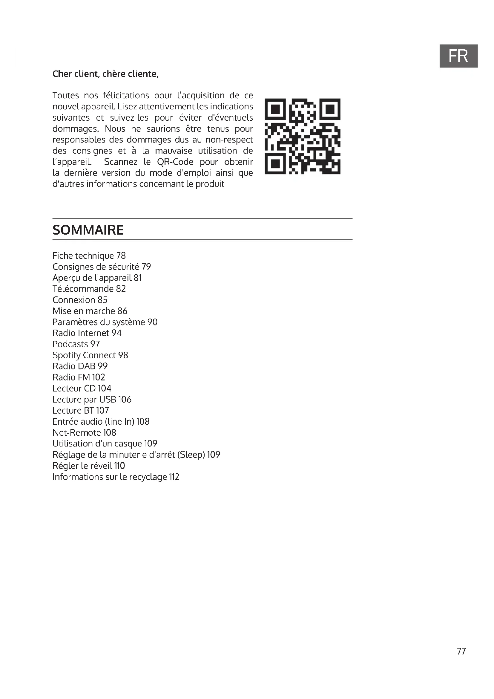 Fiche technique 78 Consignes de sécurité 79 Aperçu de l'appareil 81 Télécommande 82 Connexion 85 Mise en marche 86 Paramètres du système 90 Radio Internet 94 Podcasts 97 Spotify Connect 98 Radio DAB 99 Radio FM 102 Lecteur CD 104 Lecture par USB 106 Lecture BT 107 Entrée audio (line In) 108 Net-Remote 108 Utilisation d'un casque 109 Réglage de la minuterie d'arrêt (Sleep) 109 Régler le réveil 110 Informations sur le recyclage 112 SOMMAIRE Cher client, chère cliente, Toutes nos félicitations pour l’acquisition de ce nouvel appareil. Lisez attentivement les indications suivantes et suivez-les pour éviter d'éventuels dommages. Nous ne saurions être tenus pour responsables des dommages dus au non-respect des consignes et à la mauvaise utilisation de l’appareil. Scannez le QR-Code pour obtenir la dernière version du mode d'emploi ainsi que d'autres informations concernant le produit78