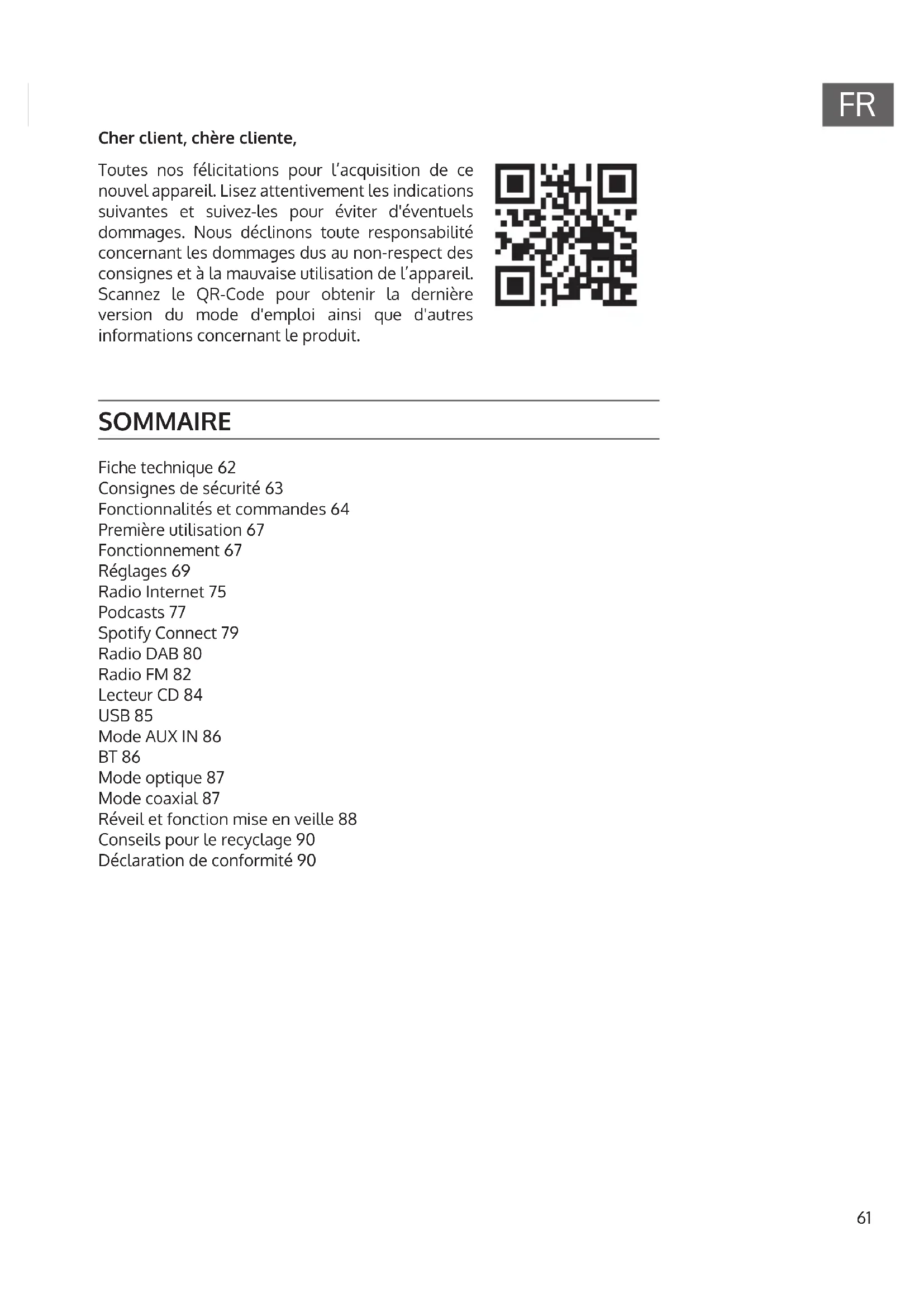 Cher client, chère cliente, Toutes nos félicitations pour l’acquisition de ce nouvel appareil. Lisez attentivement les indications suivantes et suivez-les pour éviter d'éventuels dommages. Nous déclinons toute responsabilité concernant les dommages dus au non-respect des consignes et à la mauvaise utilisation de l’appareil. Scannez le QR-Code pour obtenir la dernière version du mode d'emploi ainsi que d'autres informations concernant le produit. SOMMAIRE Fiche technique 62 Consignes de sécurité 63 Fonctionnalités et commandes 64 Première utilisation 67 Fonctionnement 67 Réglages 69 Radio Internet 75 Podcasts 77 Spotify Connect 79 Radio DAB 80 Radio FM 82 Lecteur CD 84 USB 85 Mode AUX IN 86 BT 86 Mode optique 87 Mode coaxial 87 Réveil et fonction mise en veille 88 Conseils pour le recyclage 90 Déclaration de conformité 9062