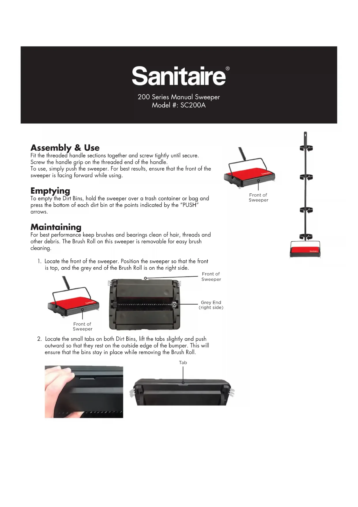 funcionará correctamente si las pestañas no se sueltan antes de su uso. Parte delantera de la barredora Parte delantera de la barredora Extremo gris (lado derecho)Balai mécanique de la série 200 N° de modèle : SC200A Assemblage et utilisation Assemblez les sections de la poignée filetée et vissez-les jusqu’à ce qu’elles soient solidement en place. Vissez le manche de la poignée sur l’extrémité filetée de la poignée. Vous n’avez qu’à pousser sur l’appareil pour le faire fonctionner. Pour des résultats optimaux, veillez à ce que la portion avant du balai mécanique soit celle qui est dirigée vers l’avant lors de l’utilisation du balai. Vidange Pour vider les bacs à poussière, tenez le balai mécanique au-dessus d’une corbeille à déchets ou d’un sac et enfoncez les repères identiés par les èches « POUSSER (PUSH) » au bas de chaque bac à poussière. Entretien Pour des résultats optimaux, enlevez tous les poils, ls et autres débris sur les brosses et les roulements. La brosse cylindrique de ce balai mécanique est amovible pour faciliter son nettoyage.
