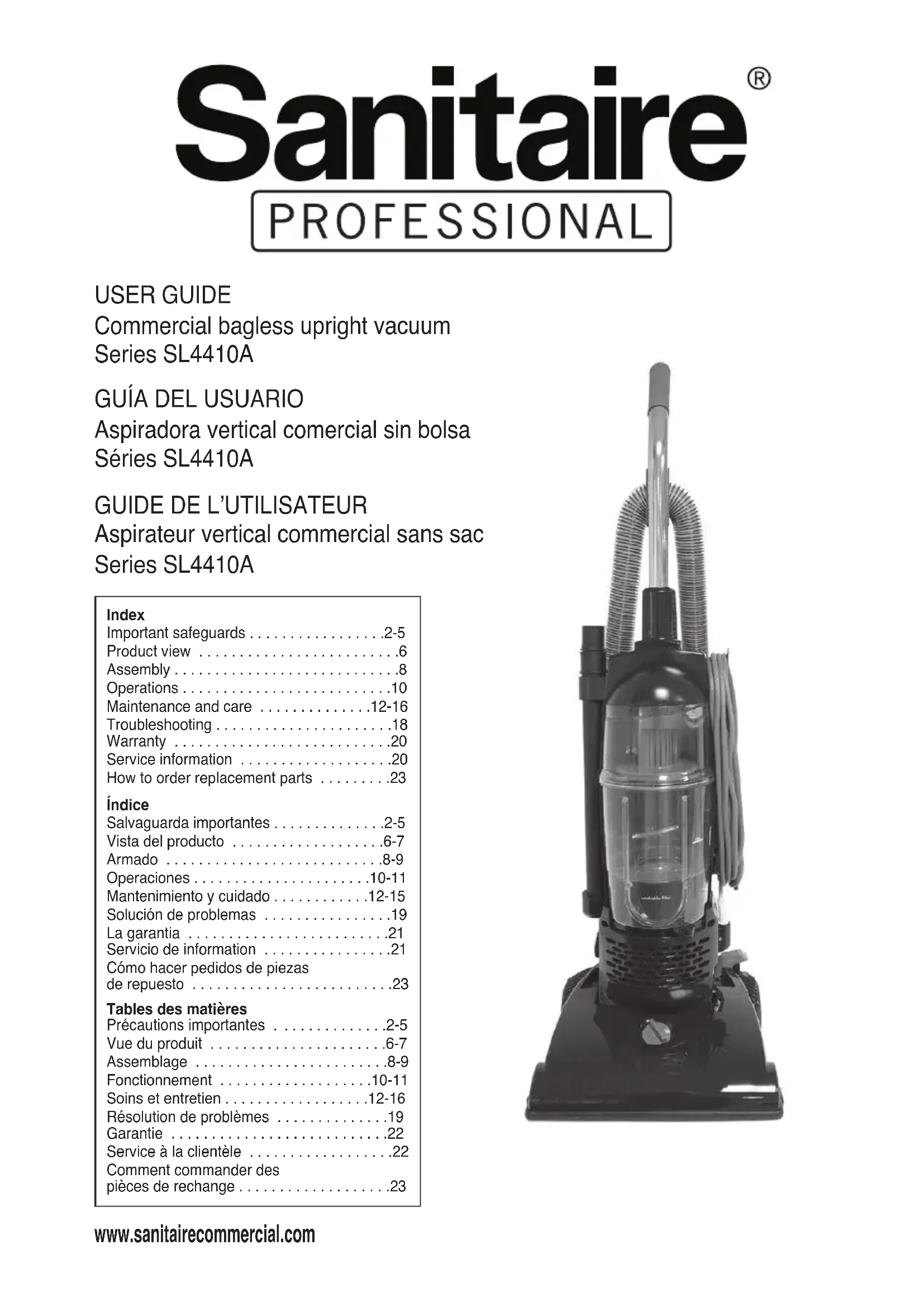 Si votre produit Sanitaire doit être réparé : Consultez le site sanitairecommercial.com, sous la rubrique des emplacements des centres de service, ou communiquez avec le service à la clientèle de Sanitaire. Si vous avez besoin d’information sur les réparations ou les pièces de rechange ou si vous avez des questions au sujet de la garantie de votre appareil, communiquez avec le service à la clientèle de Sanitaire. Site Web : www.sanitairecommercial.com Numéro de téléphone : Service à la clientèle de Sanitaire 1-800-800-8975 GARANTIE Cette garantie vous confère des droits précis. Il est possible que vous disposiez également d’autres droits, qui varient d’un État ou d’une province à l’autre. Si vous avez besoin de directives supplémentaires relatives à cette garantie ou si vous avez des questions au sujet de ce qu’elle couvre, veuillez communiquer avec le service à la clientèle de SanitaireMD par courriel, par téléphone ou par la poste de la manière décrite ci-dessous. Garantie limitée d’un an Sous réserve des *EXCEPTIONS ET EXCLUSIONS stipulées ci-dessous et à la réception du produit, Sanitaire s’engage pendant un an à compter de la date d’achat par l’acheteur initial à réparer ou à remplacer (par des pièces ou des produits neufs, remis à neuf, légèrement usés ou réusinés), à sa discrétion et sans frais, toute pièce défectueuse ou défaillante. Reportez-vous à la section intitulée « Si votre produit Sanitaire doit être réparé » ci-dessous. La présente garantie ne s’applique pas aux ventilateurs ni aux pièces d’entretien de routine telles que les filtres, les courroies et les brosses. Les dommages et défaillances causés par de la négligence, un usage abusif, une réparation non autorisée ou tout autre motif non conforme au guide de l’utilisateur ne sont pas couverts. 22 www.sanitairecommercial.comOrder genuine Sanitaire replacement parts Pida repuestos Sanitaire genuinos • Pour commander des pièces d’origine Sanitaire Visit www.sanitairecommercial.com/professional or call 1-800-800-8975 Visite www.sanitairecommercial.com/professional o llame al 1-800-800-8975 Visitez www.sanitairecommercial.com/professional ou appelez au 1-800-800-8975