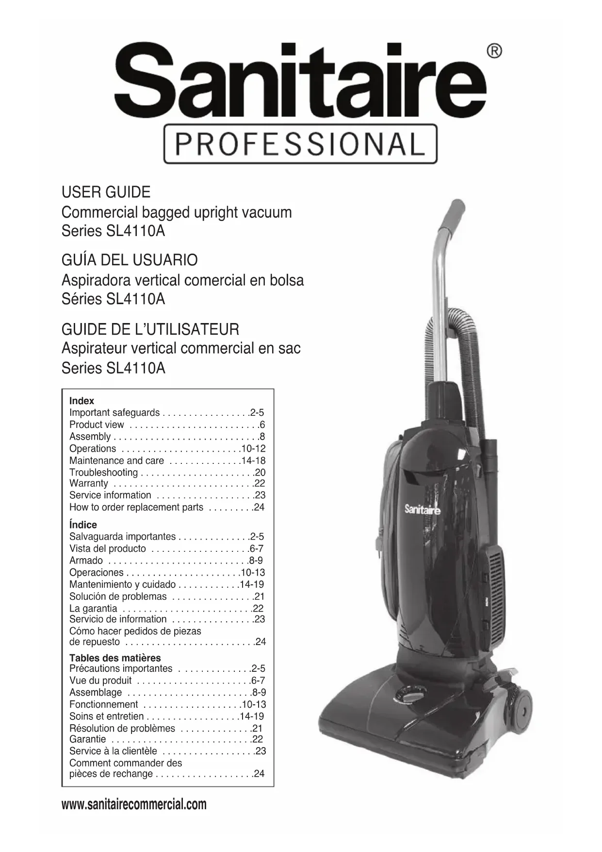 Si votre produit Sanitaire doit être réparé Consultez le site sanitairecommercial.com, sous la rubrique des emplacements des centres de service, ou communiquez avec le service à la clientèle de Sanitaire. Si vous avez besoin d’information sur les réparations ou les pièces de rechange ou si vous avez des questions au sujet de la garantie de votre appareil, communiquez avec le service à la clientèle de Sanitaire. Site Web : www.sanitairecommercial.com Numéro de téléphone : Service à la clientèle de Sanitaire 1-800-800-897524 Order genuine Sanitaire replacement parts Pida repuestos Sanitaire genuinos • Pour commander des pièces d’origine Sanitaire Visit www.sanitairecommercial.com/professional or call 1-800-800-8975 Visite www.sanitairecommercial.com/professional o llame al 1-800-800-8975 Visitez www.sanitairecommercial.com/professional ou appelez au 1-800-800-8975