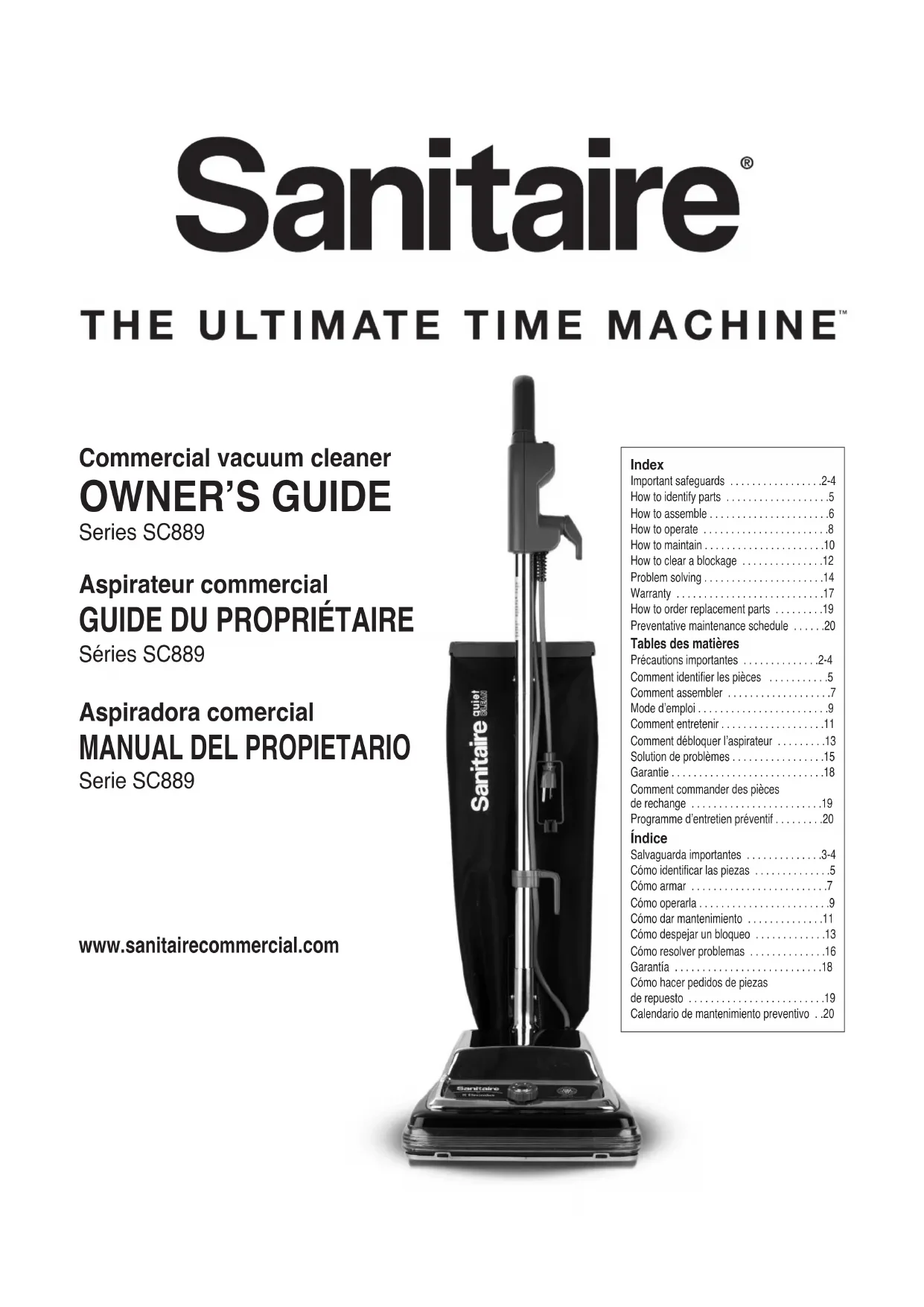 i vous entendez des sons nhabituels ou si vous constatez de auvaises performances, apportez 'appareil dans un centre de éparation Sanitaire immédiatement u appelez au 1-800-800-8975.CLOTH DUST BAGInspect the bag, clip andspring for wear. SAC À POUSSIÈRE DE TISSU nspectez le sac, l’agrafe t le ressort pour étecter l’usure VACUUM CLEANERInspect cleaner includingfan chamber (select models).ASPIRATEURInspectez l'aspirateur incluant lachambre du ventilateur (selon les modèles).POWER CORD nspect the cord for proper ssembly and wear. ORDON D’ALIMENTATIONInspectez le cordon d’alimentation pourvérifier son usure et son intégrité. MOTOR omplete a 6 month routine check done by an authorized Sanitaire repair center.MOTEURFaites effectuer une vérification deroutine aux 6 mois par un centre deréparation autorisé Sanitaire. RUSHROLLUse scissors to clip heavy threads. YLINDRE BROSSEURUtilisez des ciseaux pourcouper les gros fils. RISTLE STRIPSCheck bristles for wear and replace when less than ¼ inch. ANDE DE POILS DE BROSSAGEVérifiez si les poils sont usés et remplacez la bande lorsque leur longueurest inférieure à 6 mm (1/4 po).