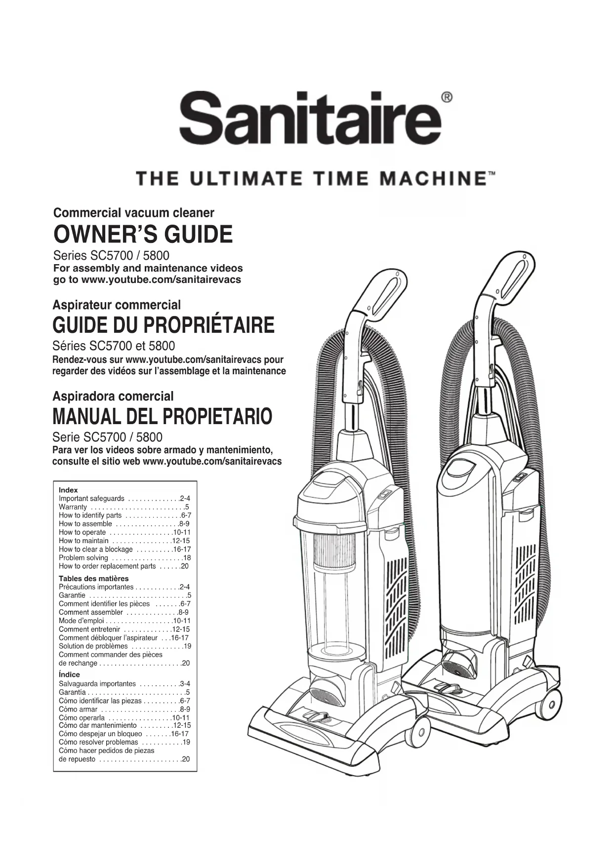 Séries SC5700 et 5800 Rendez-vous sur www.youtube.com/sanitairevacs pour regarder des vidéos sur l’assemblage et la maintenance Aspiradora comercial