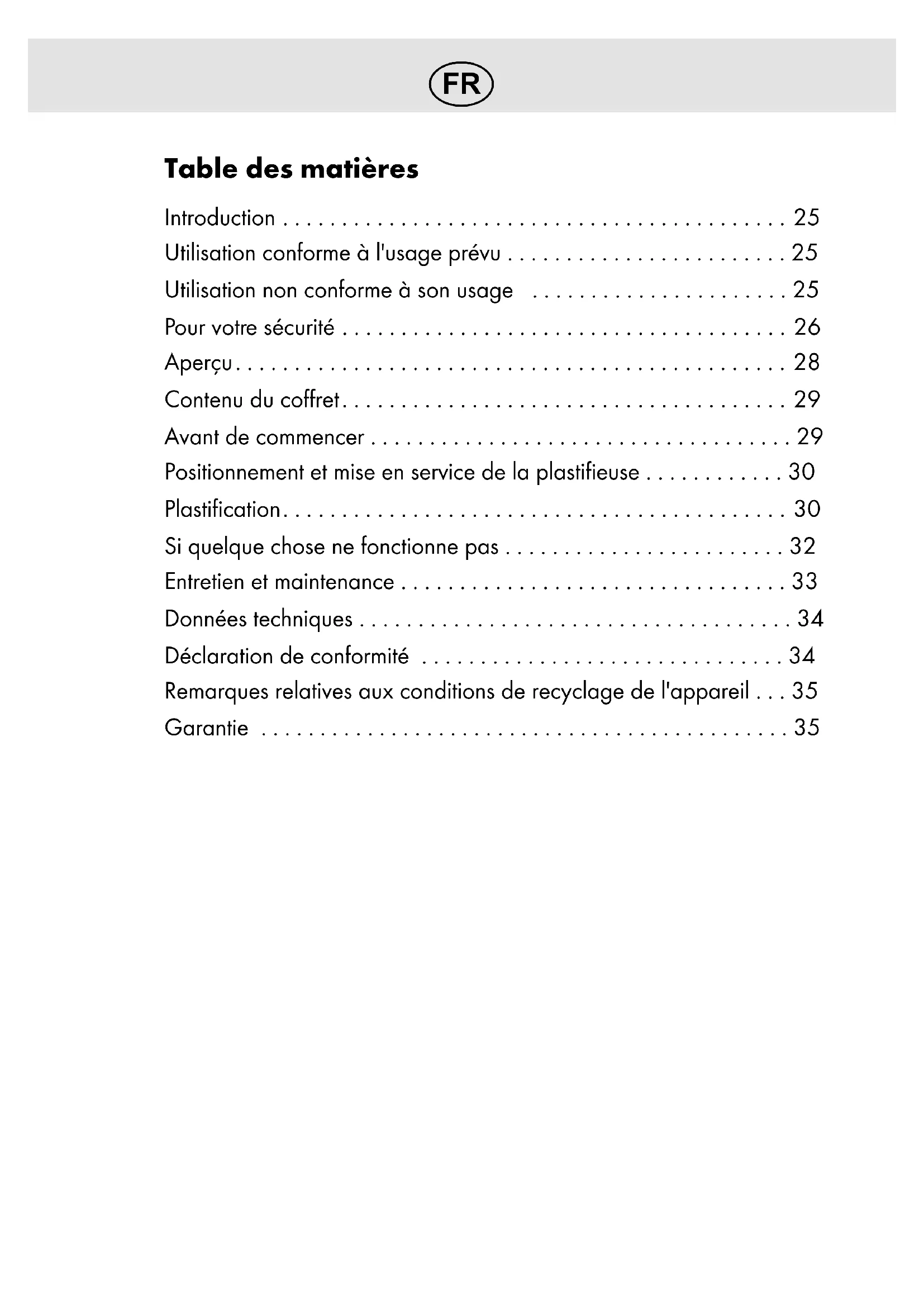 que vous ne puissiez plus voir de dépôts ou de restes de colle sur le papier. F34 Données techniques Données techniques Sous réserve de modications techniques Caractéristiques particulières Protection contre une surchaue Pas de formation de bulles 4 rouleaux Épaisseur maximale de la pochette 80 à 250 microns Largeur maximale de plastication 460 mm Épaisseur maximum de plastication 0,8 mm Temps de chaue 4 à 8 min Temps de refroidissement 15 min env. Vitesse de plastication 400 mm/min Alimentation en courant 220 à 240 V, 50 Hz Puissance absorbée 1000 W Dimensions (l x H x E) 718 x 145 x 230 mm Poids 10,1 kg Déclaration de conformité La conformité de la plastieuse est attestée par le marquage CE. Vous pouvez télécharger gratuitement la déclaration de confor- mité intégrale depuis notre site Internet www.go-europe.com F35 Remarques relatives aux conditions de recyclage de l'appareil Remarques relatives aux conditions de recyclage de l'appareil Si vous ne voulez plus vous servir de votre plastieuse, veuillez l'apporter au centre de collecte de l'organisme d'élimination des déchets de votre commune (par ex. centre de recyclage). D'après la loi relative aux appareils électriques et électroniques, les propriétaires d'appareils usagés sont tenus de mettre tous les appareils électriques et électroniques usagés dans un collecteur séparé. L'icône ci-contre signie que vous ne devez en aucun cas jeter la plastieuse dans les ordures ménagères ! Éliminez les matériaux d'emballage conformément aux régle- mentations locales. Garantie Cher client, nous sommes très heureux que vous ayez choisi cet appareil. En cas de défaut, veuillez retourner l’appareil dans son emballage d’ori- gine et accompagné du bon d’achat au magasin où vous l’avez acheté. FIndice