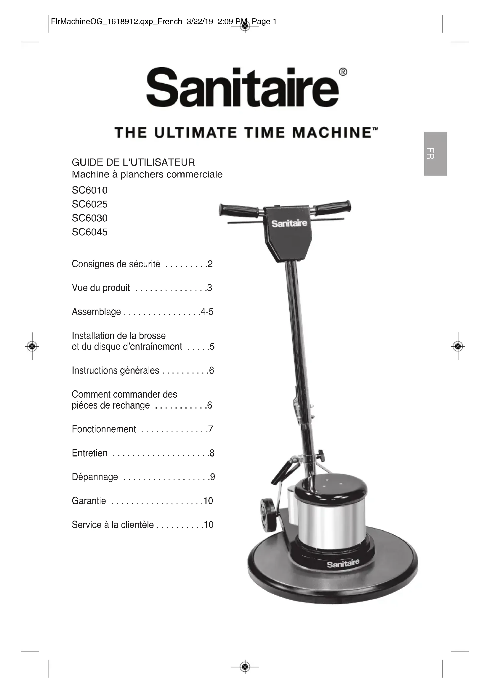 ette garantie vous confère des droits précis. Il est possible que vous disposiez également d’autres droits, qui varient d’un État ou d’une province à l’autre. Si vous avez besoin de directives supplémentaires relatives à cette garantie ou si vous avez des questions au sujet de ce qu’elle couvre, veuillez communiquer avec le service à la clientèle de SanitaireMD par courriel, par téléphone ou par la poste de la manière décrite ci-dessous. Garantie limitée d’un an Sous réserve des *EXCEPTIONS ET EXCLUSIONS stipulées ci-dessous et à la réception du produit, Sanitaire s’engage pendant un an à compter de la date d’achat par l’acheteur initial à réparer ou à remplacer (par des pièces ou des produits neufs, remis à neuf, légèrement usés ou réusinés), à sa discrétion et sans frais, toute pièce défectueuse ou défaillante. Reportez-vous à la section intitulée « Si votre produit Sanitaire doit être réparé » ci-dessous. La présente garantie ne s’applique pas aux ventilateurs ni aux pièces d’entretien de routine telles que les filtres, les courroies et les brosses. Les dommages et défaillances causés par de la négligence, un usage abusif, une réparation non autorisée ou tout autre motif non conforme au guide de l’utilisateur ne sont pas couverts. FlrMachineOG_1618912.qxp_French 3/22/19 2:09 PM Page 10FlrMachineOG_1618912.qxp_French 3/22/19 2:09 PM Page 11© 2019 BISSELL Inc Part Number PN 1618912 4/2019 www.sanitairecommercial.com FlrMachineOG_1618912.qxp_French 3/22/19 2:09 PM Page 12