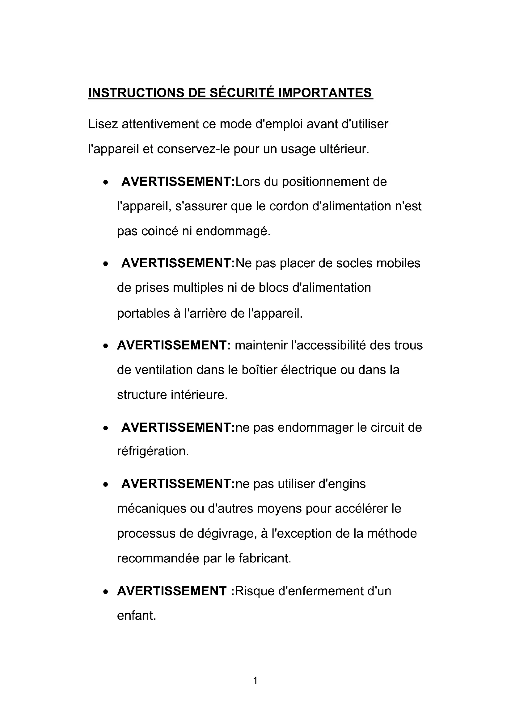 CECWC14BC CAVE À VIN - WINE CELLARINSTRUCTIONS DE SÉCURITÉ IMPORTANTES Lisez attentivement ce mode d'emploi avant d'utiliser l'appareil et conservez-le pour un usage ultérieur. x AVERTISSEMENT:Lors du positionnement de l'appareil, s'assurer que le cordon d'alimentation n'est pas coincé ni endommagé. x AVERTISSEMENT:Ne pas placer de socles mobiles de prises multiples ni de blocs d'alimentation portables à l'arrière de l'appareil. x AVERTISSEMENT: maintenir l'accessibilité des trous de ventilation dans le boîtier électrique ou dans la structure intérieure. x AVERTISSEMENT:ne pas endommager le circuit de réfrigération. x AVERTISSEMENT:ne pas utiliser d'engins mécaniques ou d'autres moyens pour accélérer le processus de dégivrage, à l'exception de la méthode recommandée par le fabricant. x AVERTISSEMENT :Risque d'enfermement d'un enfant.