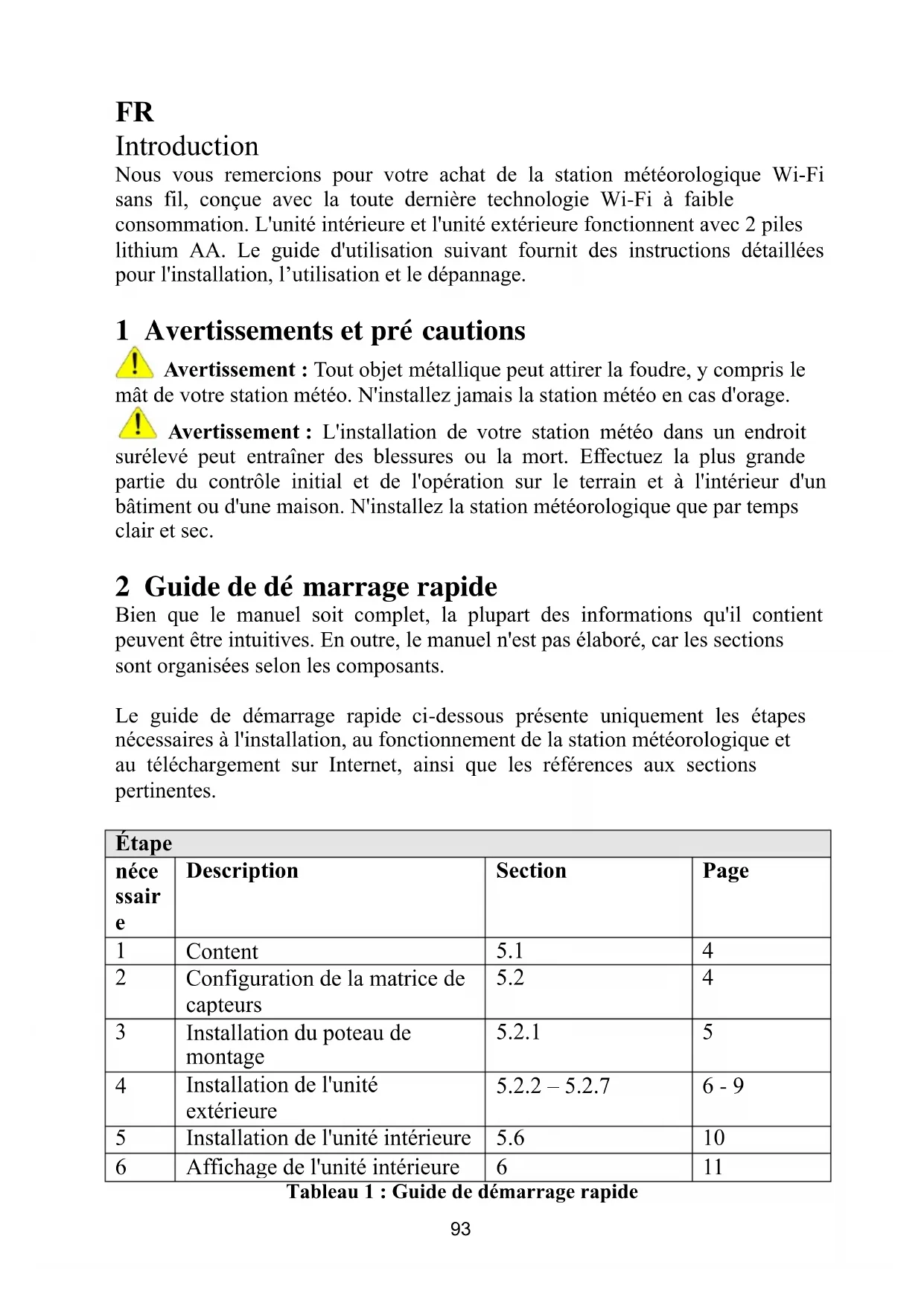 surélevé peut entraîner des blessures ou la mort. Effectuez la plus grande partie du contrôle initial et de l'opération sur le terrain et à l'intérieur d'un bâtiment ou d'une maison. N'installez la station météorologique que par temps clair et sec. 2 Guide de démarrage rapide Bien que le manuel soit complet, la plupart des informations qu'il contient peuvent être intuitives. En outre, le manuel n'est pas élaboré, car les sections sont organisées selon les composants. Le guide de démarrage rapide ci-dessous présente uniquement les étapes nécessaires à l'installation, au fonctionnement de la station météorologique et au téléchargement sur Internet, ainsi que les références aux sections pertinentes. Étape néce ssair