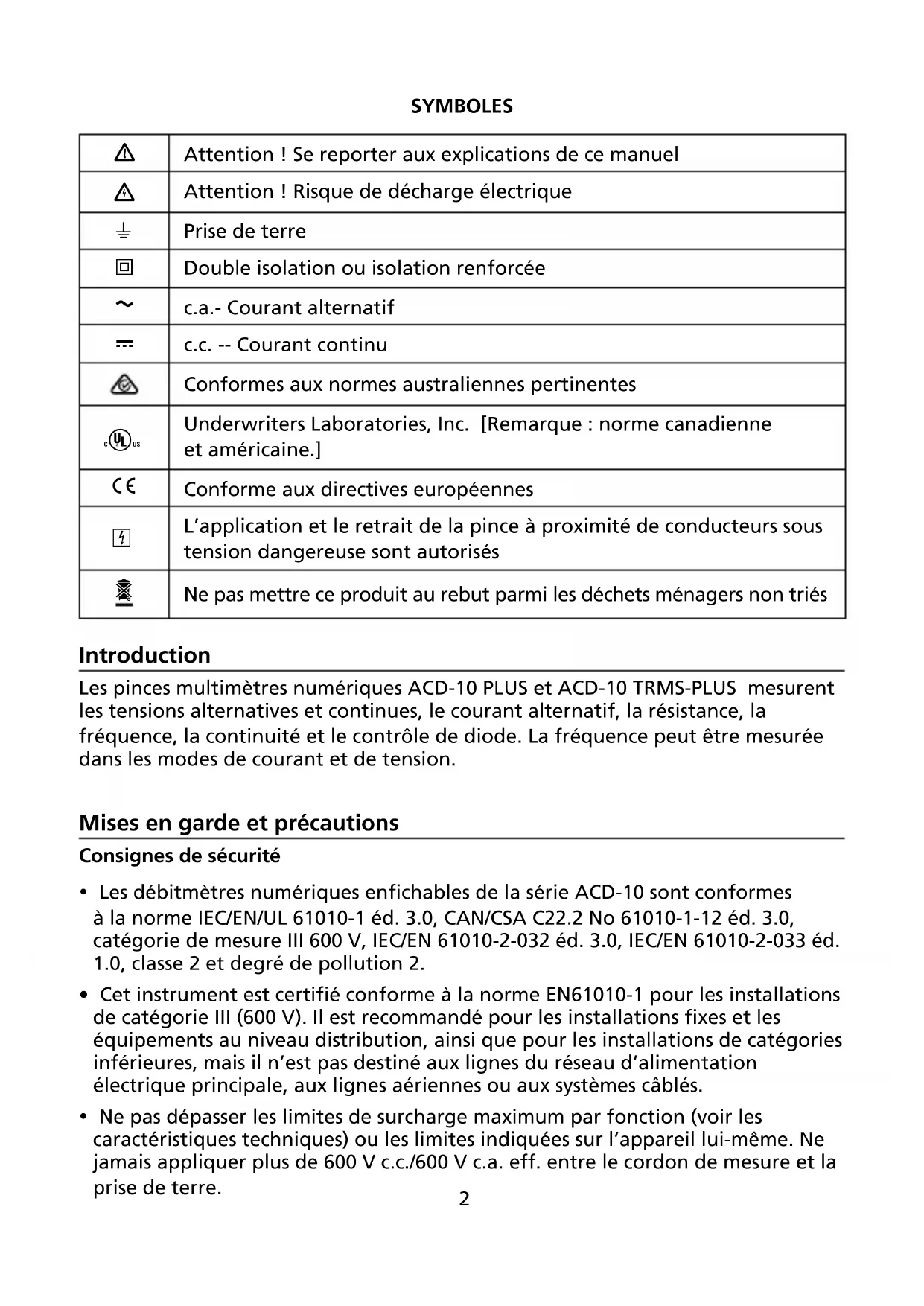 Ne pas mettre ce produit au rebut parmi les déchets ménagers non triés Introduction Les pinces multimètres numériques ACD-10 PLUS et ACD-10 TRMS-PLUS mesurent les tensions alternatives et continues, le courant alternatif, la résistance, la fréquence, la continuité et le contrôle de diode. La fréquence peut être mesurée dans les modes de courant et de tension. Mises en garde et précautions Consignes de sécurité