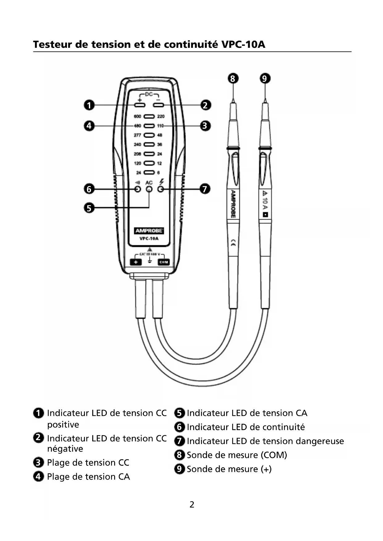 Votre emballage doit contenir : 1 Testeur de tension et de continuité VPC-10A 3 Piles 1,5 V IEC LR03 AAA 1 Manuel de l'utilisateur Si l'un de ces éléments est manquant ou endommagé, retournez l'emballage complet à votre point d'achat pour un échange. CARACTÉRISTIQUES Le testeur de tension et de continuité Amprobe VPC-10A est conçu pour être robuste et facile à utiliser pour tester la tension et la continuité. Il propose sept indicateurs de tension différenciant clairement les principaux niveaux de tension et une alerte sonore indiquant la présence de tensions et de continuité dangereuses.