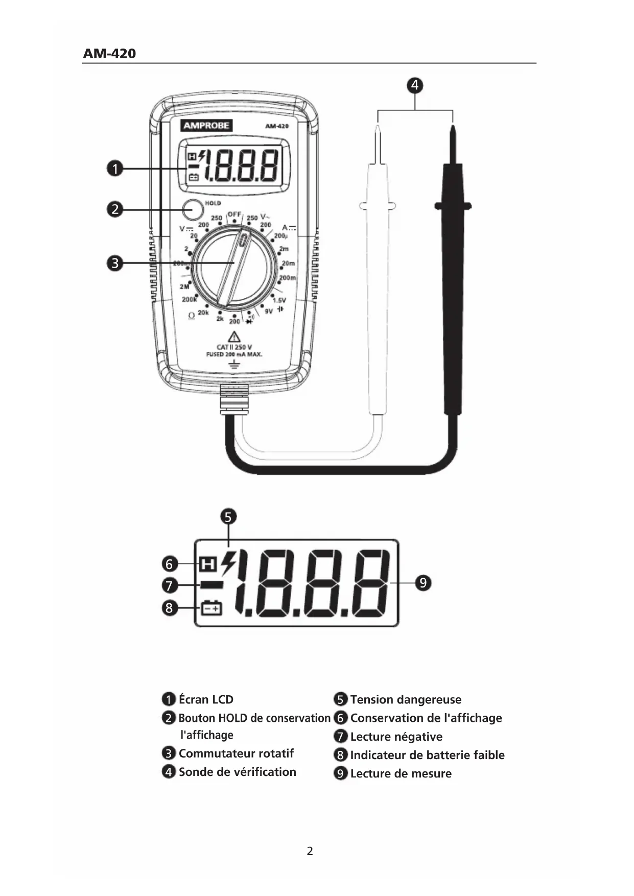 Votre emballage doit contenir : 1 Multimètre AM-420 1 Pile alcaline 9V (installée) 1 Manuel de l'utilisateur Si l'un de ces éléments est manquant ou endommagé, retournez l'emballage complet à votre point d'achat pour un échange. CARACTÉRISTIQUES Multimètre numérique résidentiel pour vérifier la tension des prises, circuits électriques, fusibles, ampoules et branchements électriques.