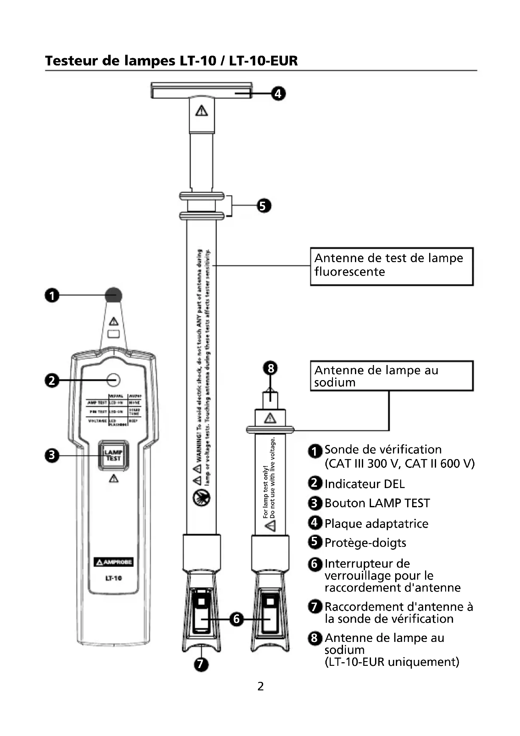 Sonde de vérication (CAT III 300 V, CAT II 600 V) Indicateur DEL Bouton LAMP TEST Plaque adaptatrice Protège-doigts Interrupteur de verrouillage pour le raccordement d'antenne Raccordement d'antenne à la sonde de vérication Antenne de lampe au sodium (LT-10-EUR uniquement) Testeur de lampes LT-10 / LT-10-EUR For lamp test only! Do not use with live voltage.