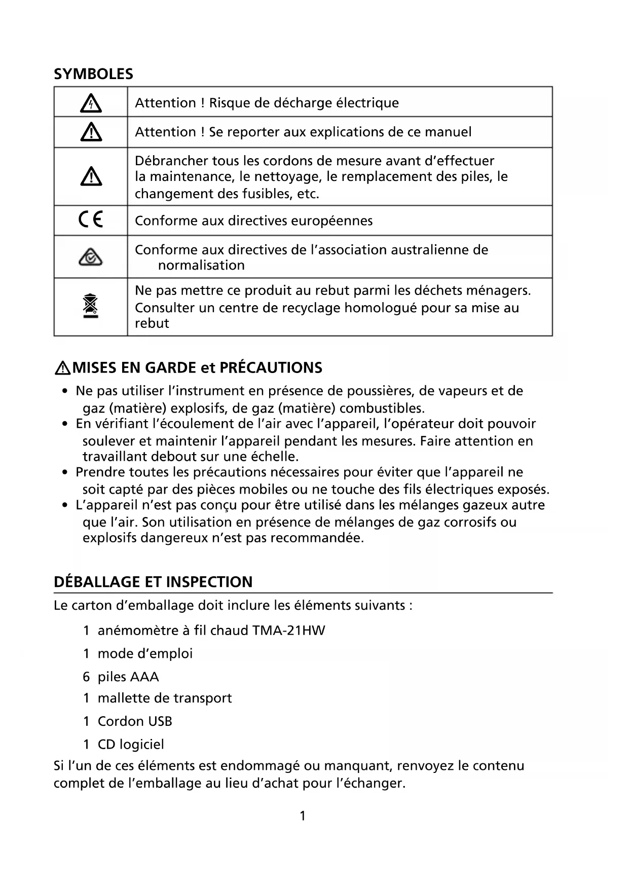 Battery use Six standard 1.5V AAA Size (NEDA 24G or IEC R03) battery Battery replacement Loosen the screw from the battery access door. Lift the battery access door and then the battery compartment up. Replace the batteries. Re-fasten the screw.TMA-21HW Anémomètre à fil chaud Mode d’emploi 9/2018, 6011500 C ©2018 Amprobe Tous droits réservés. Imprimé à Taïwan. FrançaisGarantie limitée et limitation de responsabilité Votre produit Amprobe sera exempt de défauts de matériaux et de fabrication pendant un (1) an à compter de la date d'achat, sauf exigence contraire en vertu de la juridiction locale. Cette garantie ne s'applique pas aux fusibles, aux piles jetables ou endommagées par accident, à la négligence, à la mauvaise utilisation, à l'altération, à la contamination ou aux conditions anormales d'utilisation ou de manipulation. Les revendeurs ne sont pas autorisés à prolonger toute autre garantie au nom de Amprobe. Pour une réparation au cours de la période de garantie, retournez le produit avec la preuve d'achat à un centre de service autorisé par Amprobe ou à un revendeur ou un distributeur Amprobe. Voir la section Réparation pour plus de détails. CETTE GARANTIE EST VOTRE SEUL RECOURS. TOUTES LES AUTRES GARANTIES – QU'ELLES SOIENT EXPLICITES, IMPLICITES OU JURIDIQUES – Y COMPRIS LES GARANTIES IMPLICITES D'ADAPTATION À UN USAGE PARTICULIER OU MARCHAND, SONT EXCLUES. LE FABRICANT NE SERA PAS RESPONSABLE DES DOMMAGES SPECIAUX, INDIRECTS, ACCESSOIRES OU CONSECUTIFS PROVENANT DE TOUTE CAUSE OU THEORIE. Etant donné que certains pays ou états n'autorisent pas l'exclusion ou la limitation des garanties implicites ou des dommages directs ou indirects, cette limitation de responsabilité peut ne pas s'appliquer à vous. Réparation Tout produit Amprobe retourné pour réparation sous garantie ou hors garantie ou pour l'étalonnage doit être accompagné des documents suivants:votre nom, le nom de votre société, votre adresse, votre numéro de téléphone et la preuve d'achat. De plus, veuillez inclure une brève description du problème ou du service demandé et incluez les cordons de mesure avec le compteur. Les frais de réparation ou de remplacement non garantis doivent être réglés sous forme de chèque, mandat, carte de crédit avec date d'expiration ou bon de commande payable à Amprobe/Beha-Amprobe Réparation et remplacement couverts par la garantie – Tous les pays Veuillez lire la déclaration de garantie et vérifier la pile avant de demander une réparation. Pendant la période de garantie, tout outil de vérification défectueux peut être retourné à votre distributeur Amprobe pour un échange de produit identique ou similaire. Veuillez consulter la section «Où acheter» sur le site amprobe.com pour obtenir une liste des distributeurs près de chez vous. En outre, aux États-Unis et au Canada, les réparations sous garantie et les unités de remplacement peuvent également être envoyés à un centre de service Amprobe (voir adresse ci-dessous). Réparation et remplacement non couverts par la garantie – États-Unis et Canada Pour les réparations non couvertes par la garantie aux États-Unis et au Canada, l'appareil doit être envoyé à un centre de service Amprobe. Appelez Amprobe ou renseignez-vous auprès de votre point de vente pour les tarifs de réparation et de remplacement actuels. États-Unis: Canada: Amprobe Amprobe Everett, WA 98203 Mississauga, ON L4Z 1X9 Tél.: 877-AMPROBE (267-7623) Tél.: 905-890-7600 Réparation et remplacement non couverts par la garantie – Europe Les unités hors garantie européenne peuvent être remplacées par votre distributeur Amprobe/ Beha-Amprobe pour une somme modique. Veuillez consulter la section «Où acheter» sur le site beha-amprobe.com pour obtenir une liste des distributeurs près de chez vous. Beha-Amprobe Division et marque déposée de Fluke Corp. (USA) Allemagne* Royaume-Uni Pays-Bas - Siège social** In den Engematten 14 52 Hurricane Way Science Park Eindhoven 5110 79286 Glottertal Norwich, Norfolk 5692 EC Son Allemagne NR6 6JB Royaume-Uni Pays-Bas Téléphone : +49 (0) 7684 8009 - 0 Téléphone: +44 (0) 1603 25 6662 Téléphone: +31 (0) 40 267 51 00 beha-amprobe.de beha-amprobe.com beha-amprobe.com *(Correspondance uniquement: aucune réparation ou remplacement à cette adresse. Clients européens, veuillez contacter votre distributeur.) **adresse de contact unique dans l'EEE Fluke Europe BVTABLE DES MATIÈRES SYMBOLES .............................................................................................................1