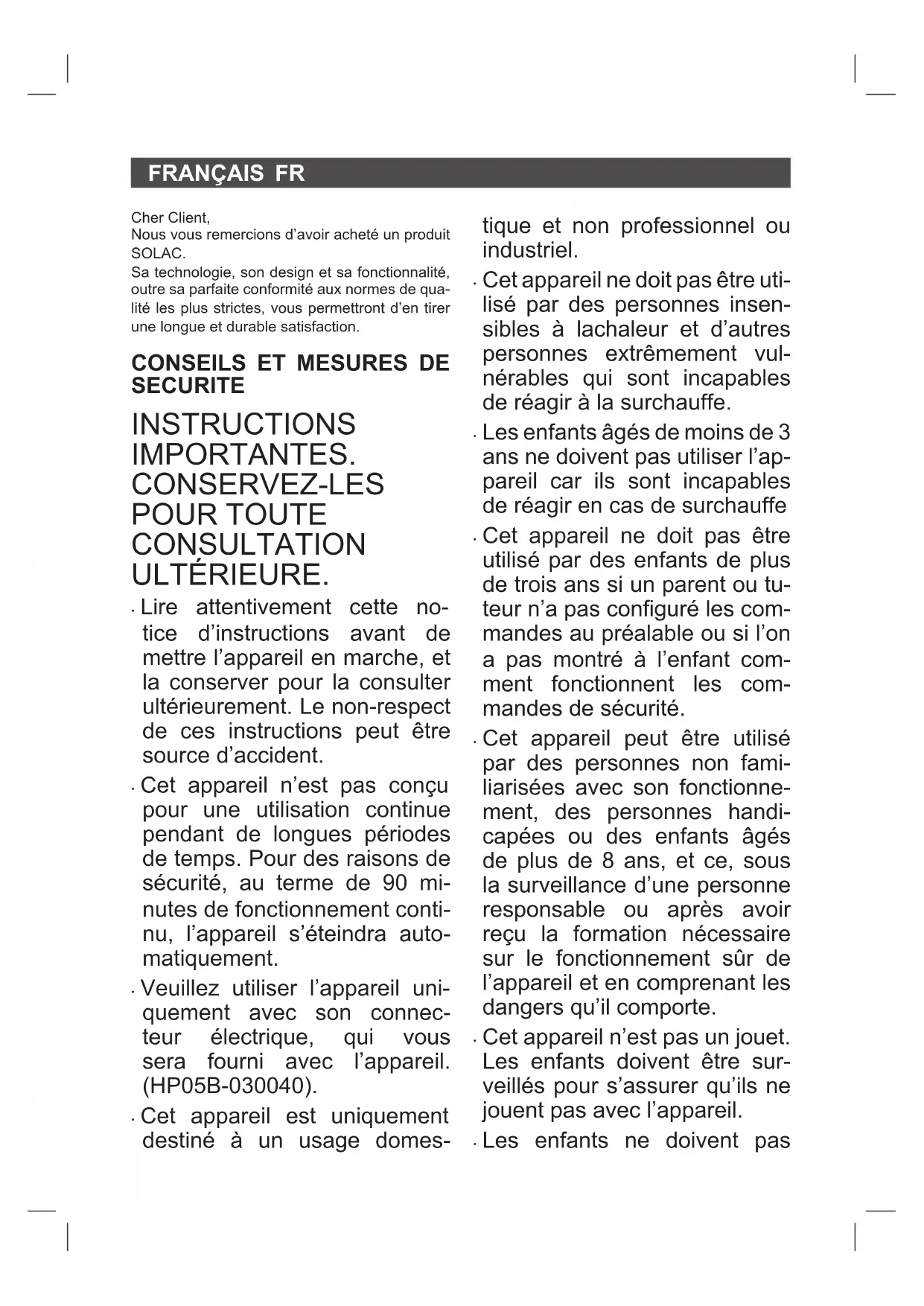 TECHNIQUE Ce produit est reconnu et protégé par la garantie établie conformément à la législation en vigueur. Pour faire valoir vos droits ou intérêts, vous de- vrez vous adresser à l’un de nos services d’as- sistance technique agréés. Pour savoir lequel est le plus proche, vous pou- vez accéder au lien suivant : http://solac.com Vous pouvez aussi nous contacter pour toute information. Vous pouvez télécharger ce manuel d’instruc- tions et ses mises à jour sur http://solac.com