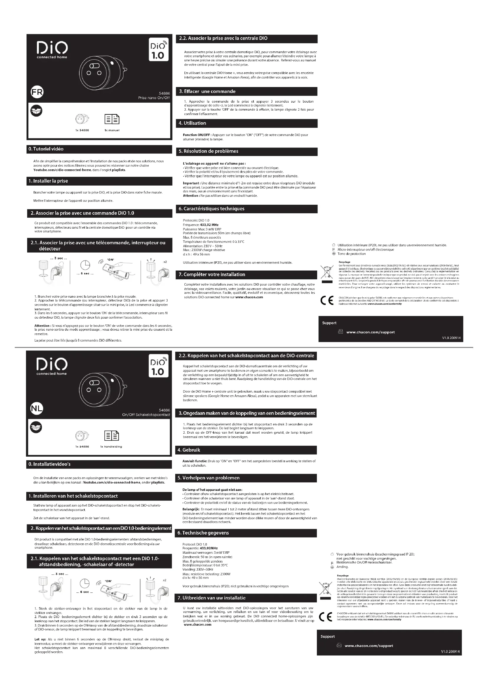 Complétez votre installation avec les solutions DiO pour contrôler votre chauage, votre éclairage, vos volets roulants, votre jardin ou encore visualiser ce qui se passe chez vous avec la vidéosurveillance. Facile, qualitatif, évolutif et économique, découvrez toutes les solutions DiO connected home sur www.chacon.com Utilisation intérieure (IP20), ne pas utiliser dans un environnement humide. Micro-interrupteur on/o électronique Terre de protection Voor gebruik binnenshuis (beschermingsgraad IP 20); niet geschikt voor vochtige omgevingen. Elektronische On/O microschakelaar. Arrding. CHACON déclare que la mini prise 54886 est conforme aux exigences essentielles et aux autres dispositions pertinentes de la directive RED 2014/53/EU. Le texte complet de la déclaration UE de conformité est disponible à l’adresse internet suivante: www.chacon.com/conformityRecyclageConformément aux directives européennes DEEE(2002/96/EC) et relative aux accumulateurs (2006/66/EC), tout appareil électrique, électronique ou accumulateur doit être collecté séparément par un système local et spécialisé de collecte des déchets. Ne jetez pas ces produits avec les déchets ordinaires. Consultez la réglementation en vigueur. La marque en forme de poubelle indique que ce produit ne doit pas être jeté avec les ordures ménagères dans aucun des pays de l’UE. An de prévenir tout risque sur l’environnement ou la santé humaine lié à la mise au rebut incontrôlée, recyclez le produit de façon responsable an de promouvoir l’utilisation durable des ressources matérielles. Pour renvoyer votre appareil usagé, utilisez les systèmes de renvoi et collecte ou contactez le revendeur d’origine. Il se chargera du recyclage dans le respect des dispositions règlementaires. Protocole: DiO 1.0 Fréquence: 433,92 MHz Puissance Max: 3 mW EIRP Portée de transmission: 50m (en champs libre) Max. 8 émetteurs associés Température de fonctionnement: 0 à 35°C Alimentation: 230 V ~ 50Hz Max.: 2300W charge résistive d x h : 49 x 56 mm Utilisation intérieure (IP20), ne pas utiliser dans un environnement humide. 1. Branchez votre prise nano avec la lampe branchée à la prise murale. 2. Approcher la télécommande (ou interrupteur, détecteur DiO) de la prise et appuyer 3 secondes sur le bouton d’apprentissage situé sur la mini prise, la Led commence à clignoter lentement.3. Dans les 6 secondes, appuyer sur le bouton 'ON' de la télécommande, interrupteur sans l ou détecteur DiO, la lampe clignote deux fois pour conrmer l'association. 1. Approcher la commande de la prise et appuyer 3 secondes sur le bouton d’apprentissage de celle-ci, la Led commence à clignoter lentement.2. Appuyer sur la touche 'OFF' de la commande à eacer, la lampe clignote 2 fois pour conrmer l'eacement. Ce produit est compatible avec l'ensemble des commandes DiO 1.0 : télécommande, interrupteurs, détecteurs sans l et la centrale domotique DiO pour un contrôle via votre smartphone.