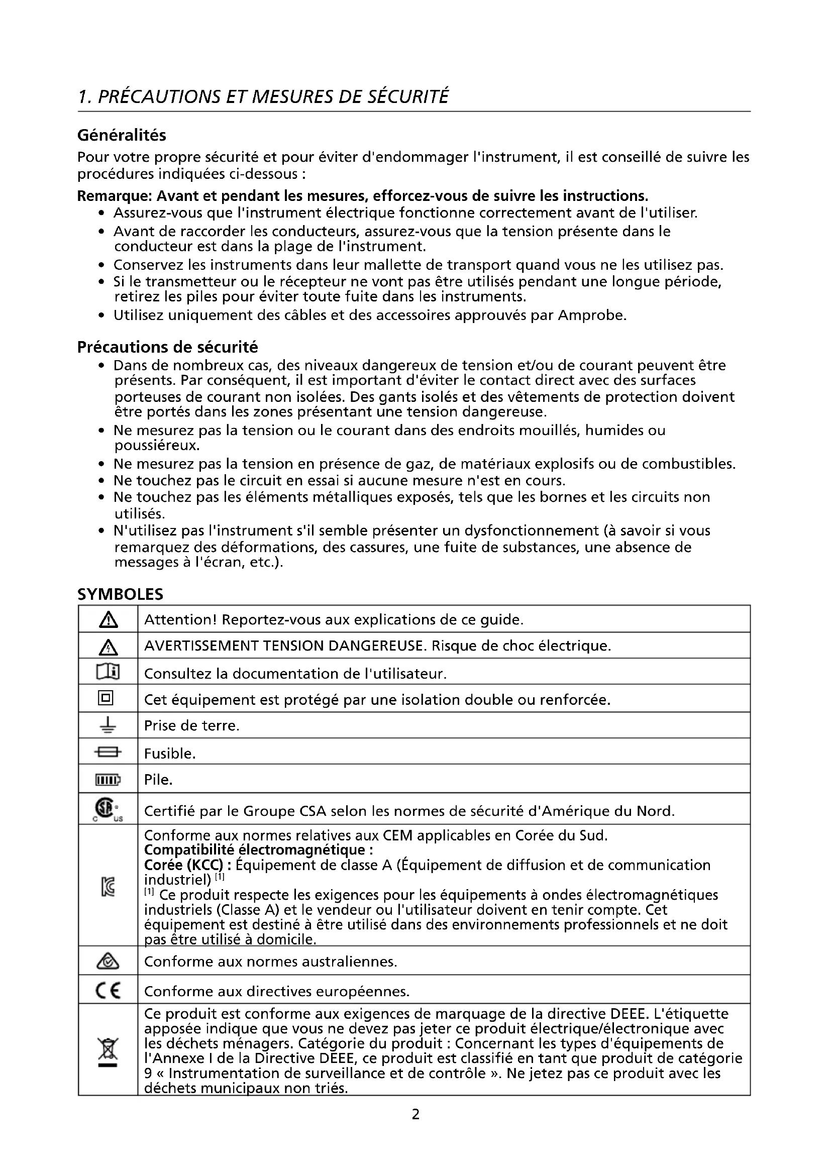 - Utilisez uniquement des câbles et des accessoires approuvés par Amprobe. Précautions de sécurité