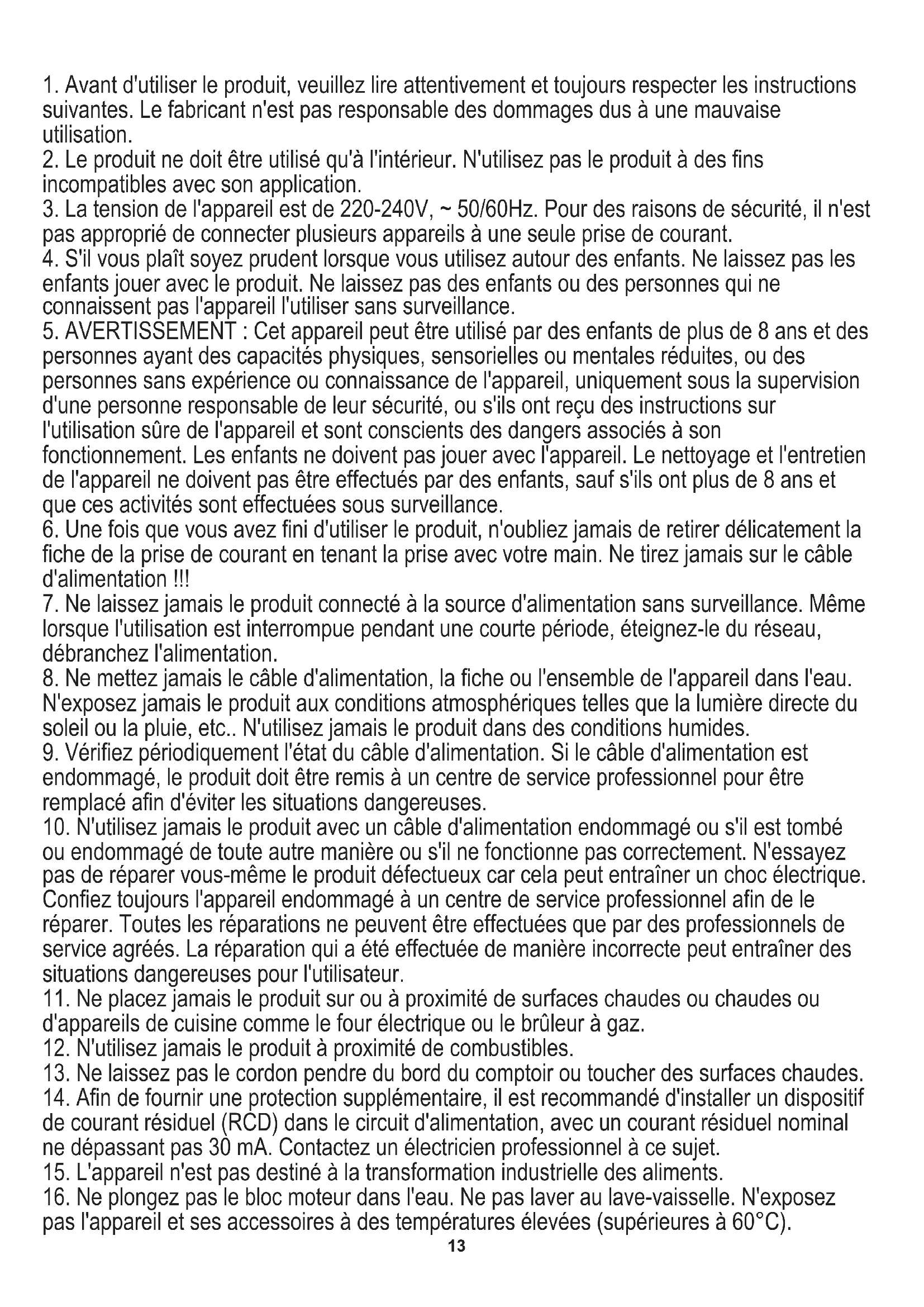 13. Ne laissez pas le cordon pendre du bord du comptoir ou toucher des surfaces chaudes.