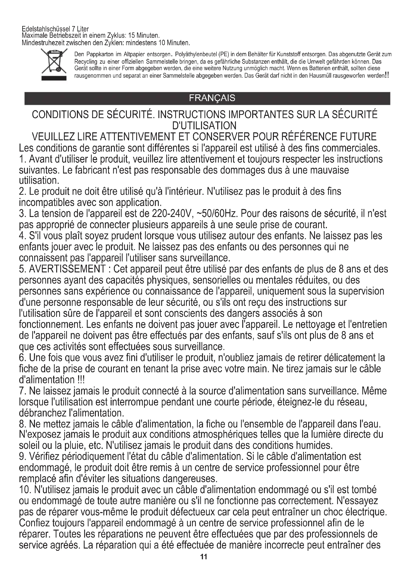 Alimentation : 220-240V ~50/60Hz Puissance : 1200W Puissance maximale : 2 200 W Bol en acier inoxydable 7 litres Temps de fonctionnement maximum en un cycle : 15 minutes. Temps de repos minimum entre les cycles : 10 minutes au moins. Respect de l'environnement. Nous vous prions de bien vouloir trier les emballages en carton ainsi que les sachets plastiques (en polyéthylène). L'appareil usagé ne doit pas être jeté à la poubelle mais remis au point de collecte prévu à cet effet car il contient des éléments pouvant être nocifs pour l'environnement. L'appareil électrique doit être remis de manière à limiter au maximum une éventuelle utilisation ultérieure. Si l'appareil contient des piles, il faut les retirer et les remettre à un autre point de collecte. Ne pas jeter l'appareil dans une poubelle de déchets ménagers !!! ESPAÑOL