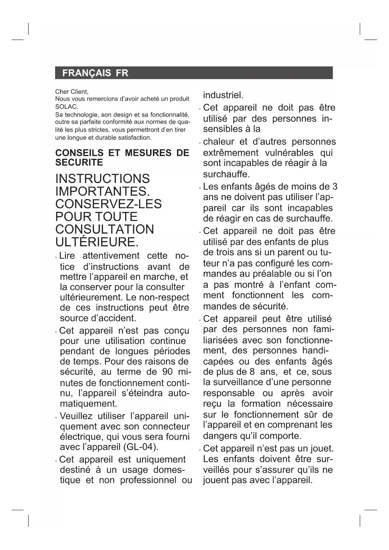 TECHNIQUE Ce produit est reconnu et protégé par la garantie établie conformément à la législation en vigueur. Pour faire valoir vos droits ou intérêts, vous de- vrez vous adresser à l’un de nos services d’as- sistance technique agréés. Pour savoir lequel est le plus proche, vous pou- vez accéder au lien suivant : http://solac.com Vous pouvez aussi nous contacter pour toute information. Vous pouvez télécharger ce manuel d’instruc- tions et ses mises à jour sur http://solac.com
