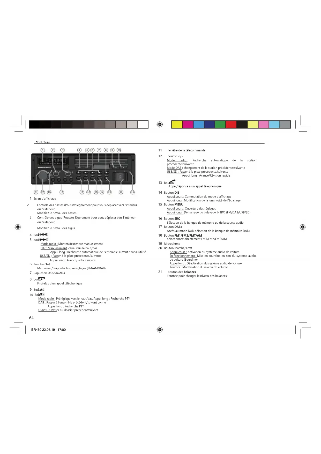 1 Écran d’affichage 2 Contrôle des basses (Poussez légèrement pour vous déplacer vers l’intérieur ou l’extérieur) Modifiez le niveau des basses 3 Contrôle des aigus (Poussez légèrement pour vous déplacer vers l’intérieur ou l’extérieur) Modifiez le niveau des aigus 4 Bouton 5 Bouton Mode radio : Monter/descendre manuellement. DAB: Manuellement, canal vers le haut/bas Appui long : Recherche automatique de l’ensemble suivant / canal utilisé USB/SD : Passer à la piste précédente/suivante Appui long : Avance/Retour rapide 6 Touches 1–5 Mémoriser/ Rappeler les préréglages (FM/AM/DAB) 7 Capuchon USB/SD/AUX 8 bouton Fin/refus d’un appel téléphonique 9 Bouton 10 Bouton Mode radio : Préréglage vers le haut/bas. Appui long : Recherche PTY DAB : Passer à l’ensemble précédent/suivant connu Appui long : Recherche PTY USB/SD : Passer au dossier précédent/suivant 11 Fenêtre de la télécommande 12 Bouton </> Mode radio : Recherche automatique de la station précédente/suivante Mode DAB : changement de la station précédente/suivante USB/SD : Passer à la piste précédente/suivante Appui long : Avance/Révision rapide 13 bouton Appel/réponse à un appel téléphonique 14 Bouton DIS Appui court : Commutation du mode d’affichage Appui long : Modification de la luminosité de l’éclairage 15 Bouton MENU Appui court : Ouverture des réglages Appui long : Démarrage du balayage INTRO (FM/DAB/USB/SD) 16 Bouton SRC Sélection de la banque de mémoire ou de la source audio 17 Bouton DAB+ Accès au mode DAB, sélection de la banque de mémoire DAB+ 18 Bouton FM1/FM2/FMT/AM Sélectionnez directement FM1/FM2/FMT/AM 19 Microphone 20 Bouton Marche/Arrêt Appui court : Activation du système audio de voiture En fonctionnement : Mise en sourdine du son du système audio de voiture (Sourdine) Appui long : Déactivation du système audio de voiture Tourner : Modification du niveau de volume 21 Bouton des balances Tournez pour changer le niveau des balancesBR460 22.05.19 17:00 AUTORADIO