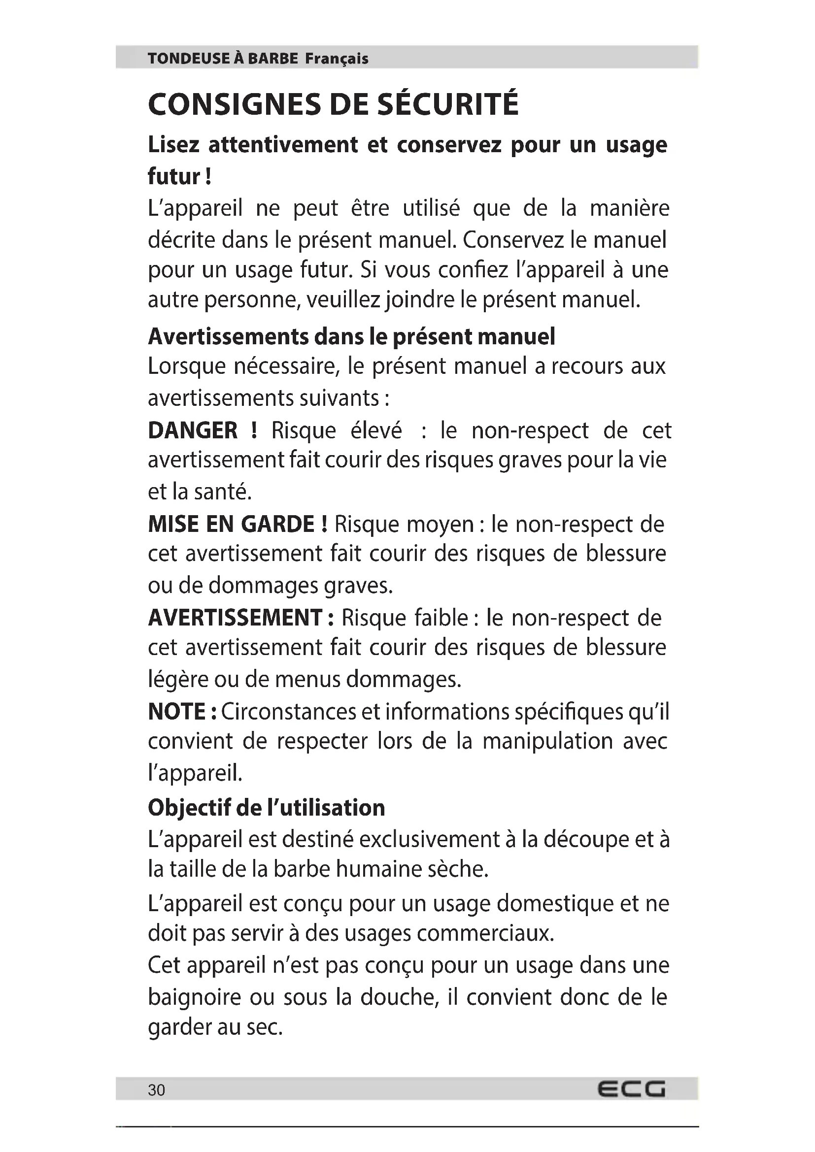 cet avertissement fait courir des risques de blessure légère ou de menus dommages. NOTE: Circonstances et informations spéciques qu’il convient de respecter lors de la manipulation avec l’appareil. Objectif de l’utilisation L’appareil est destiné exclusivement à la découpe et à la taille de la barbe humaine sèche. L’appareil est conçu pour un usage domestique et ne doit pas servir à des usages commerciaux. Cet appareil n’est pas conçu pour un usage dans une baignoire ou sous la douche, il convient donc de le garder au sec.31 TONDEUSE À BARBE Français L’appareil ne peut être utilisé qu’à l’intérieur. Possibilités d’utilisation incorrecte N’utilisez pas l’appareil pour couper des cheveux ou la fourrure d’animaux.
