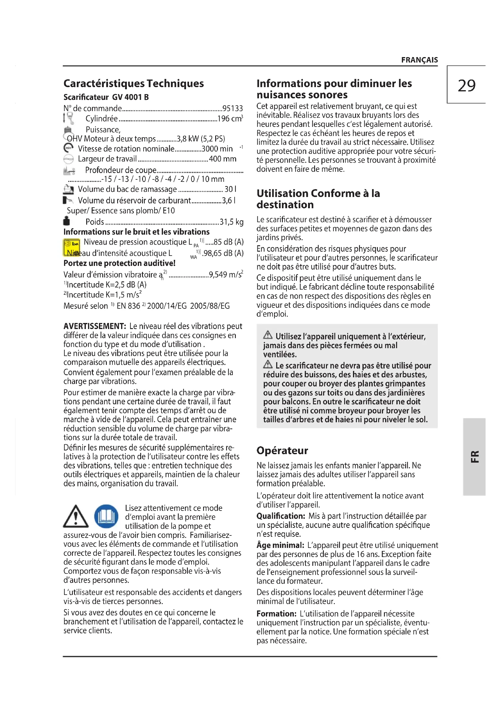 Provide appropriate servicing upon the earlier of the following: in the given month or after the specied hours of operation have expired. Defects searching Defect Cause Measure The motor does not start Primary pump has not been used Use the primary pump Lack of fuel Add some fuel Bowden cables are too long Adjust the Bowden cables using the coupling nut. Wrong fuel, storing without petrol tank being drained Drain the fuel tank and carburettor. Add fresh petrol. Sooted spark plug (carbon residues on electrodes), electrodes distance too big Clean the spark plug, check the plug ther- mal value, possibly change the plug, set the electrodes distance to 0.6-0.7 mm The spark plug is wet from petrol (oversaturated engine). Dry the spark plug out and ret it. Little oil in the engine Add oil Grass is not collected Blocked channel Full collection bag Too wet grass Clean the ejection channel Empty the collection bag Cut in dry weather29 FRANÇAIS Informations pour diminuer les nuisances sonores Cet appareil est relativement bruyant, ce qui est inévitable. Réalisez vos travaux bruyants lors des heures pendant lesquelles c‘est légalement autorisé. Respectez le cas échéant les heures de repos et limitez la durée du travail au strict nécessaire. Utilisez une protection auditive appropriée pour votre sécuri- té personnelle. Les personnes se trouvant à proximité doivent en faire de même. Utilisation Conforme à la destination Le scaricateur est destiné à scarier et à démousser des surfaces petites et moyennes de gazon dans des jardins privés. En considération des risques physiques pour l‘utilisateur et pour d‘autres personnes, le scaricateur ne doit pas être utilisé pour d‘autres buts. Ce dispositif peut être utilisé uniquement dans le but indiqué. Le fabricant décline toute responsabilité en cas de non respect des dispositions des règles en vigueur et des dispositions indiquées dans ce mode d‘emploi. Utilisez l‘appareil uniquement à l‘extérieur, jamais dans des pièces fermées ou mal ventilées. Le scaricateur ne devra pas être utilisé pour réduire des buissons, des haies et des arbustes, pour couper ou broyer des plantes grimpantes ou des gazons sur toits ou dans des jardinières pour balcons. En outre le scaricateur ne doit être utilisé ni comme broyeur pour broyer les tailles d‘arbres et de haies ni pour niveler le sol. Opérateur Ne laissez jamais les enfants manier l’appareil. Ne laissez jamais des adultes utiliser l’appareil sans formation préalable. L’opérateur doit lire attentivement la notice avant d’utiliserl’appareil. Qualication: Mis à part l’instruction détaillée par unspécialiste, aucune autre qualication spécique n’estrequise. Âge minimal: L’appareil peut être utilisé uniquement par despersonnes de plus de 16 ans.Exception faite des adolescents manipulant l’appareil dans lecadre de l’enseignement professionnel sous la surveil