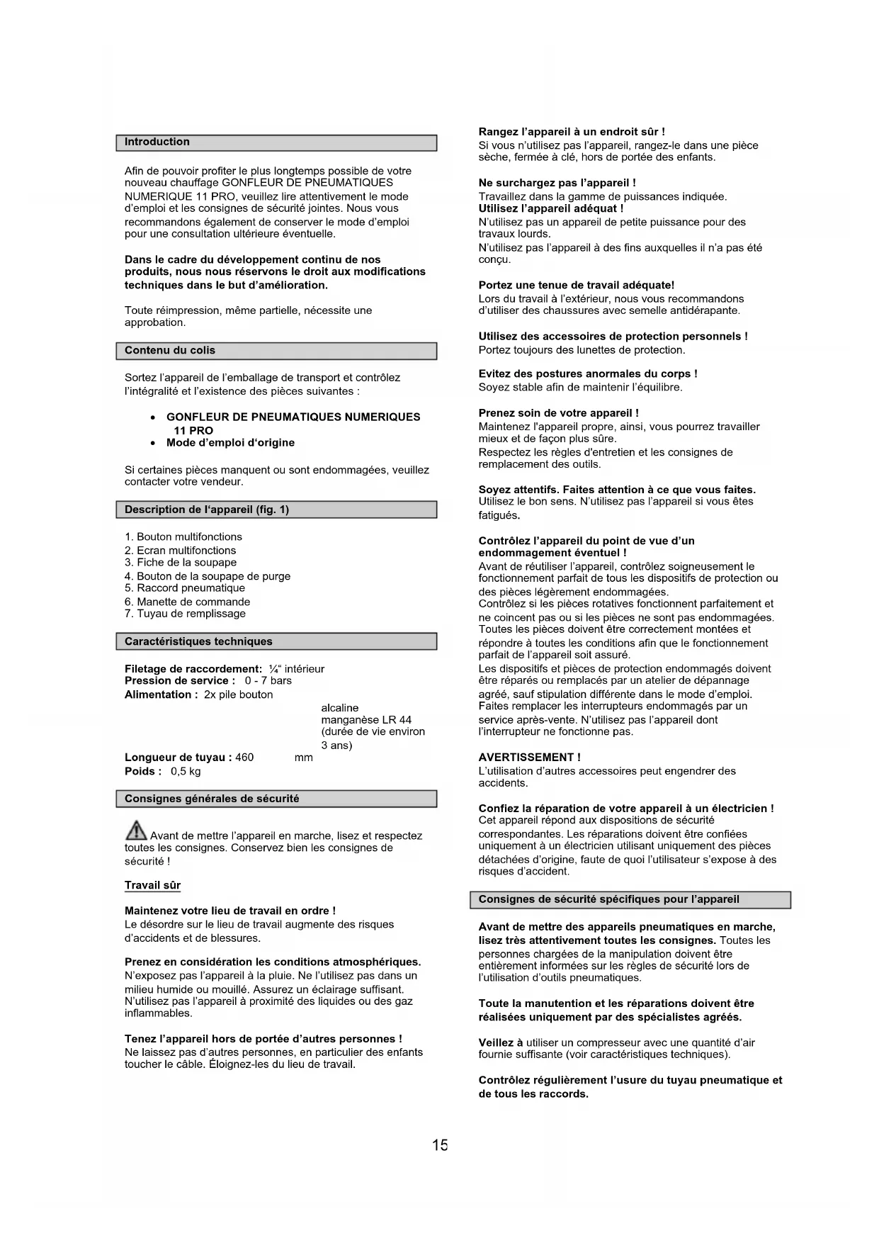 Caractéristiques techniques Filetage de raccordement: ¼“ intérieur Pression de service : 0 - 7 bars Alimentation : 2x pile bouton alcaline manganèse LR 44 (durée de vie environ 3 ans) Longueur de tuyau : 460 mm Poids : 0,5 kg Consignes générales de sécurité Avant de mettre l’appareil en marche, lisez et respectez toutes les consignes. Conservez bien les consignes de sécurité ! Travail sûr Maintenez votre lieu de travail en ordre ! Le désordre sur le lieu de travail augmente des risques d’accidents et de blessures. Prenez en considération les conditions atmosphériques. N’exposez pas l’appareil à la pluie. Ne l’utilisez pas dans un milieu humide ou mouillé. Assurez un éclairage suffisant. N’utilisez pas l’appareil à proximité des liquides ou des gaz inflammables. Tenez l’appareil hors de portée d’autres personnes ! Ne laissez pas d’autres personnes, en particulier des enfants toucher le câble. Éloignez-les du lieu de travail. Rangez l’appareil à un endroit sûr ! Si vous n’utilisez pas l’appareil, rangez-le dans une pièce sèche, fermée à clé, hors de portée des enfants. Ne surchargez pas l’appareil ! Travaillez dans la gamme de puissances indiquée. Utilisez l’appareil adéquat ! N’utilisez pas un appareil de petite puissance pour des travaux lourds. N’utilisez pas l’appareil à des fins auxquelles il n’a pas été conçu. Portez une tenue de travail adéquate! Lors du travail à l’extérieur, nous vous recommandons d’utiliser des chaussures avec semelle antidérapante. Utilisez des accessoires de protection personnels ! Portez toujours des lunettes de protection. Evitez des postures anormales du corps ! Soyez stable afin de maintenir l’équilibre. Prenez soin de votre appareil ! Maintenez l'appareil propre, ainsi, vous pourrez travailler mieux et de façon plus sûre. Respectez les règles d'entretien et les consignes de remplacement des outils. Soyez attentifs. Faites attention à ce que vous faites. Utilisez le bon sens. N’utilisez pas l’appareil si vous êtes fatigués. Contrôlez l’appareil du point de vue d’un endommagement éventuel ! Avant de réutiliser l’appareil, contrôlez soigneusement le fonctionnement parfait de tous les dispositifs de protection ou des pièces légèrement endommagées. Contrôlez si les pièces rotatives fonctionnent parfaitement et ne coincent pas ou si les pièces ne sont pas endommagées. Toutes les pièces doivent être correctement montées et répondre à toutes les conditions afin que le fonctionnement parfait de l’appareil soit assuré. Les dispositifs et pièces de protection endommagés doivent être réparés ou remplacés par un atelier de dépannage agréé, sauf stipulation différente dans le mode d’emploi. Faites remplacer les interrupteurs endommagés par un service après-vente. N’utilisez pas l’appareil dont l’interrupteur ne fonctionne pas. AVERTISSEMENT ! L’utilisation d’autres accessoires peut engendrer des accidents. Confiez la réparation de votre appareil à un électricien ! Cet appareil répond aux dispositions de sécurité correspondantes. Les réparations doivent être confiées uniquement à un électricien utilisant uniquement des pièces détachées d’origine, faute de quoi l’utilisateur s’expose à des risques d’accident. Consignes de sécurité spécifiques pour l’appareil Avant de mettre des appareils pneumatiques en marche, lisez très attentivement toutes les consignes. Toutes les personnes chargées de la manipulation doivent être entièrement informées sur les règles de sécurité lors de l’utilisation d’outils pneumatiques. Toute la manutention et les réparations doivent être réalisées uniquement par des spécialistes agréés. Veillez à utiliser un compresseur avec une quantité d’air fournie suffisante (voir caractéristiques techniques). Contrôlez régulièrement l’usure du tuyau pneumatique et de tous les raccords. 15Portez l‘appareil par la poignée, jamais par le câble. Votre main ne doit pas se trouver à proximité du bouton de mise en marche. L‘appareil n’est pas mis à la terre et isolé contre l’électricité. Ne l’utilisez en aucun cas dans les endroits avec possibilité de contact avec l’électricité. Débranchez l’appareil non utilisé de l’amenée d’air. Ne procédez JAMAIS au remplacement d’accessoires et ne procédez à AUCUN entretien tant que l’appareil est branché à une arrivée d’air. Veillez à ne pas endommager les tuyaux et raccords en portant l’appareil par le tuyau ou en tirant dessus pour le débrancher de l’arrivée d’air. Évitez que le tuyau entre en contact avec des températures excessives, de l’huile et des bords tranchants. Remplacez le tuyau lorsqu’il est endommagé ou usé. La pression d’air lors du fonctionnement de l’appareil NE DOIT PAS DÉPASSER 7 bars. Utilisez un régulateur de pression permettant de réduire la pression d’air à 7 bars. Comportez-vous de façon responsable envers les tiers. Veillez à une bonne stabilité. Respectez le mode d’emploi/règles de fonctionnement du compresseur. Risque d’explosion ! Ne pas utiliser dans un environnement avec risque d’explosion et respecter la pression maximale. Utilisez uniquement l’air comprimé. AVERTISSEMENT ! Maintenez le tuyau de remplissage sifflant avec fiche pendant le remplissage et le vidage. Ne pliez pas le tuyau de remplissage. AVERTISSEMENT ! Maintenez le tuyau pneumatique sifflant lors de l’ouverture du raccord rapide ! ATTENTION ! Risque de trébuchement ! Evitez ou faites attention aux tuyaux pneumatiques posés sur le sol ! Soyez reposé et concentré lors de l’utilisation afin d’assurer un fonctionnement sûr. Protégez-vous ainsi que d’autres personnes, animaux, objets et votre environnement à l’aide des mesures de protection adéquates, en vous formant sur le fonctionnement de la machine et en adoptant des mesures de prév