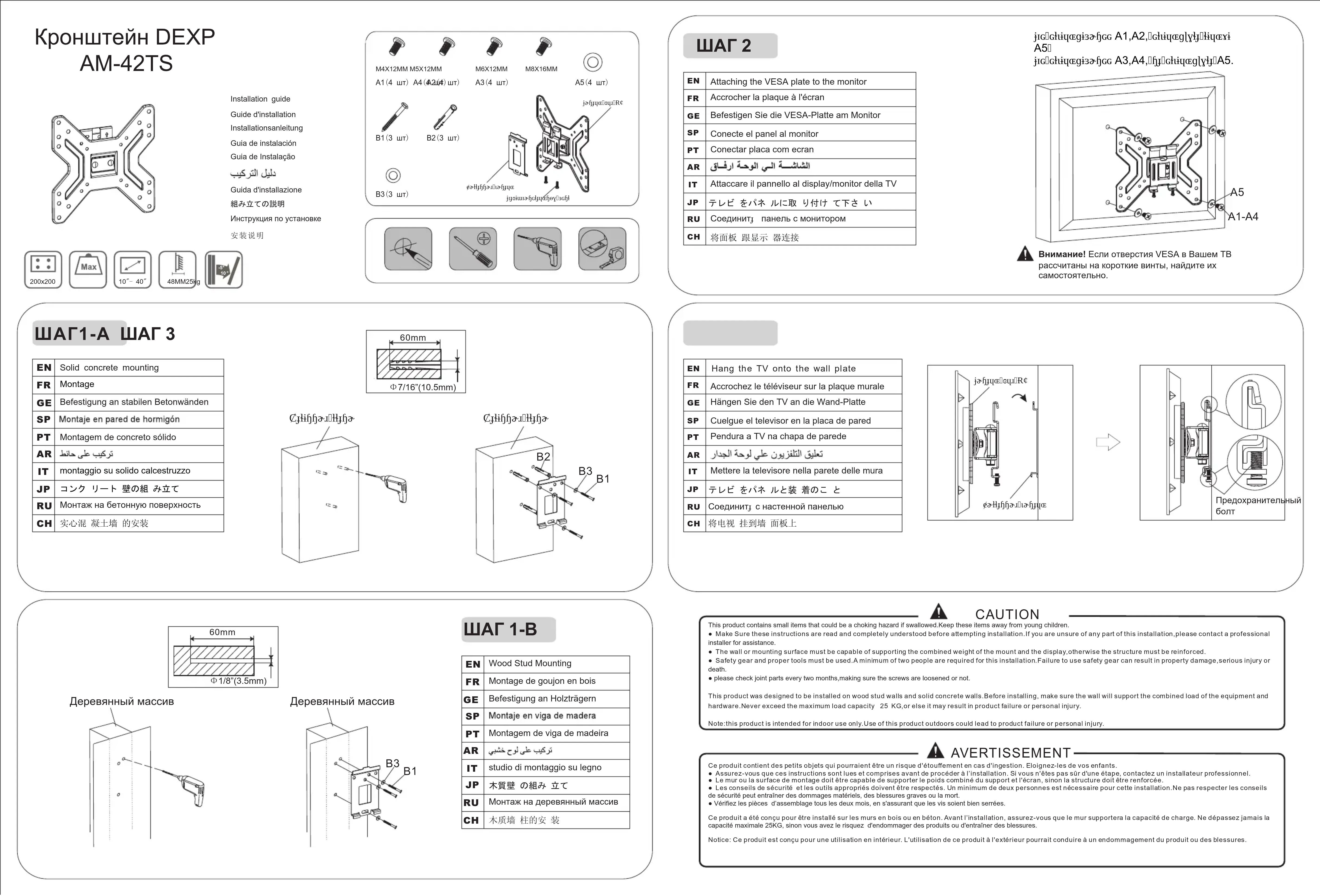 テレビ をパネ ルに取 り付け て下さ いConectar placa com ecranConecte el panel al monitor Accrocher la plaque à l'écranBefestigen Sie die VESA-Platte am MonitorAttaccare il pannello al display/monitor della TVCоединитɟ панель с монитором ШАГ 2 CAUTION This product contains small items that could be a choking hazard if swallowed.Keep these items away from young children. ● Make Sure these instructions are read and completely understood before attempting installation.If you are unsure of any part of this installation,please contact a professional installer for assistance. ● The wall or mounting surface must be capable of supporting the combined weight of the mount and the display,otherwise the structure must be reinforced. ● Safety gear and proper tools must be used.A minimum of two people are required for this installation.Failure to use safety gear can result in property damage,serious injury or death.● please check joint parts every two months,making sure the screws are loosened or not. This product was designed to be installed on wood stud walls and solid concrete walls.Before installing, make sure the wall will support the combined load of the equipment and hardware.Never exceed the maximum load capacity 25 KG,or else it may result in product failure or personal injury. Note:this product is intended for indoor use only.Use of this product outdoors could lead to product failure or personal injury. AVERTISSEMENT Ce produit contient des petits objets qui pourraient être un risque d'étouffement en cas d'ingestion. Eloignez-les de vos enfants. ● Assurez-vous que ces instructions sont lues et comprises avant de procéder à l’installation. Si vous n'êtes pas sûr d'une étape, contactez un installateur professionnel. ● Le mur ou la surface de montage doit être capable de supporter le poids combiné du support et l'écran, sinon la structure doit être renforcée. ● Les conseils de sécurité et les outils appropriés doivent être respectés. Un minimum de deux personnes est nécessaire pour cette installation.Ne pas respecter les conseils de sécurité peut entraîner des dommages matériels, des blessures graves ou la mort. ● Vérifiez les pièces d’assemblage tous les deux mois, en s'assurant que les vis soient bien serrées. Ce produit a été conçu pour être installé sur les murs en bois ou en béton. Avant l’installation, assurez-vous que le mur supportera la capacité de charge. Ne dépassez jamais la capacité maximale 25KG, sinon vous avez le risquez d'endommager des produits ou d'entraîner des blessures. Notice: Ce produit est conçu pour une utilisation en intérieur. L'utilisation de ce produit à l'extérieur pourrait conduire à un endommagement du produit ou des blessures. ɉɪɢɢɫɩɨɥɶɡɨɜɚɧɢɢ A1,A2,ɢɫɩɨɥɶɡɭɣɬɟɬɨɥɶɤɨ