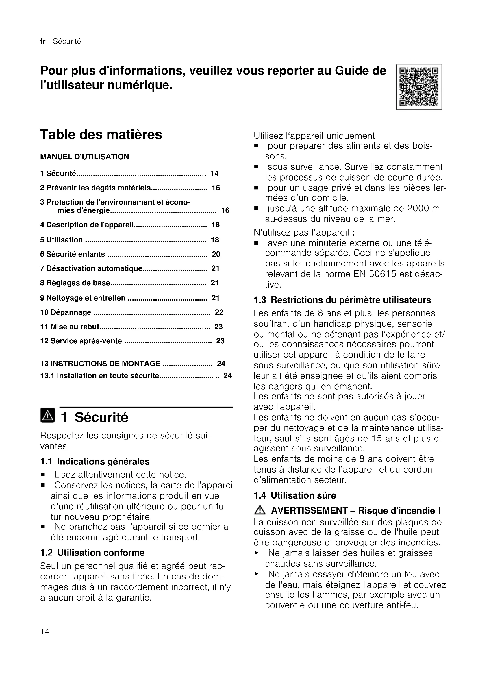 1 Sécurité Respectez les consignes de sécurité sui- vantes. 1.1 Indications générales ¡ Lisez attentivement cette notice. ¡ Conservez les notices, la carte de l'appareil ainsi que les informations produit en vue d’une réutilisation ultérieure ou pour un fu- tur nouveau propriétaire. ¡ Ne branchez pas l’appareil si ce dernier a été endommagé durant le transport. 1.2 Utilisation conforme Seul un personnel qualifié et agréé peut rac- corder l'appareil sans fiche. En cas de dom- mages dus à un raccordement incorrect, il n'y a aucun droit à la garantie. Utilisez l‘appareil uniquement: ¡ pour préparer des aliments et des bois- sons. ¡ sous surveillance. Surveillez constamment les processus de cuisson de courte durée. ¡ pour un usage privé et dans les pièces fer- mées d’un domicile. ¡ jusqu'à une altitude maximale de 2000m au-dessus du niveau de la mer. N’utilisez pas l’appareil: ¡ avec une minuterie externe ou une télé- commande séparée. Ceci ne s'applique pas si le fonctionnement avec les appareils relevant de la norme EN 50615 est désac- tivé. 1.3 Restrictions du périmètre utilisateurs Les enfants de 8 ans et plus, les personnes souffrant d’un handicap physique, sensoriel ou mental ou ne détenant pas l’expérience et/ ou les connaissances nécessaires pourront utiliser cet appareil à condition de le faire sous surveillance, ou que son utilisation sûre leur ait été enseignée et qu’ils aient compris les dangers qui en émanent. Les enfants ne sont pas autorisés à jouer avec l'appareil. Les enfants ne doivent en aucun cas s’occu- per du nettoyage et de la maintenance utilisa- teur, sauf s’ils sont âgés de 15ans et plus et agissent sous surveillance. Les enfants de moins de 8ans doivent être tenus à distance de l’appareil et du cordon d’alimentation secteur. 1.4 Utilisation sûre AVERTISSEMENT‒Risque d'incendie! La cuisson non surveillée sur des plaques de cuisson avec de la graisse ou de l'huile peut être dangereuse et provoquer des incendies. ▶ Ne jamais laisser des huiles et graisses chaudes sans surveillance. ▶ Ne jamais essayer d'éteindre un feu avec de l'eau, mais éteignez l'appareil et couvrez ensuite les flammes, par exemple avec un couvercle ou une couverture anti-feu.Sécurité fr