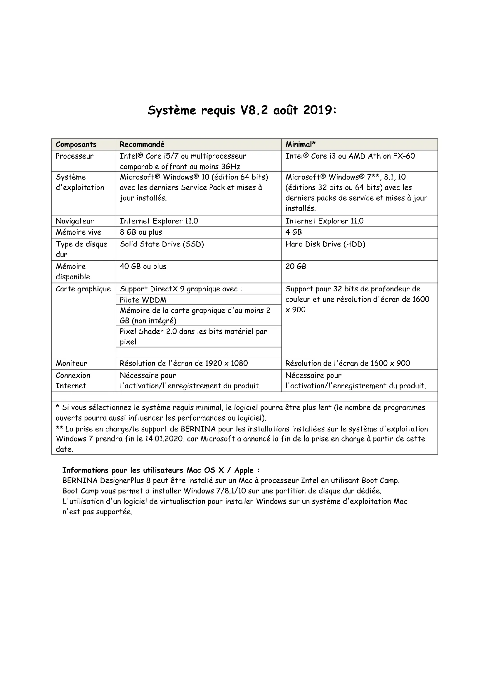 - Si vous sélectionnez le système requis minimal, le logiciel pourra être plus lent (le nombre de programmes ouverts pourra aussi influencer les performances du logiciel). ** La prise en charge/le support de BERNINA pour les installations installées sur le système d'exploitation Windows 7 prendra fin le 14.01.2020, car Microsoft a annoncé la fin de la prise en charge à partir de cette date.