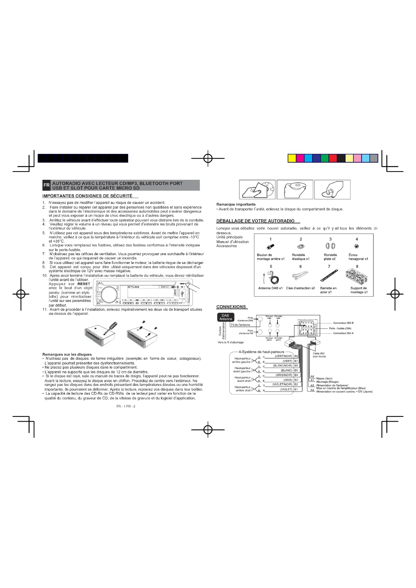 autre touche numérique pendant plus de 2 secondes pour enregistrer cette station sur cette touche numérique. Remarque: L’unité peut enregistrer jusqu’à 6 stations pour chaque bande. RDS (Radio Data System) Cette unité dispose d’un décodeur RDS intégré compatible avec les données RDS transmises par les stations de diusions. Ce système permet de passer automatiquement vers la station de diusion avec la meilleure réception lorsque vous vous déplacez sur de longues ditances (interversion AF). Par ailleurs, si un programme d’annonce de trac (TA) ou un type de programme (PTY) est diusé depuis une station RDS, ce programme sera reçu peu importe dans quel mode vous êtes. Tenez la molette de volume appuyée, l’unité passera dans le menu de conguration. Appuyez brièvement sur la molette de volume pour choisir la conguration correspondant à votre choix: AF (ON/OFF) TA (ON/OFF) TA-V REG (ON/OFF) EON (OFF/ON) PTY OFF (MUSIC/SPEECH) SYNC (ON/OFF). - Fréquence alternative (AF) Quand le mode de commutation AF est sélectionné, la radio vérie l’intensité du signal des fréquences alternatives. Quand une fréquence alternative a un signal plus fort que la station en cours, l’appareil change pour cette station, et la nouvelle frequence est achée pour 1 à 2 secondes. (Lorsque AF clignote, l’appareil recherche une station RDS plus puissante). « AF » non aché: Mode de commutation AF arrêté. « AF » aché: Mode de commutation AF activé, et les informations RDS sont reçues. « AF » clignotant: Mode de commutation AF activé, mais les informations RDS ne sont pas encore reçues. - Fonction TA (informations routières) Dans le mode TA veille, lorsqu’une annonce de trac démarre, la diusion de l’annonce de trac est reçue en priorité indiéremment de la fonction, an que vous puissiez l’écouter. Si vous choisissez le mode TA éteint, lorsqu’une annonce de trac est diusée et reçue, la réception est annulée et l’unité passe en mode TA veille. Sélection de la bande de fréquences En mode FM, appuyez de manière répétée sur la touche BAND pour sélectionner la bande de fréquences: FM1 FM2 FM3. Recherche manuelle / automatique de stations - Recherche manuelle Appuyez longuement sur la touche ou jusqu’à ce que l’indication «MANUAL» (manuel) s’ache, puis appuyez sur la touche sur la touche pour augmenter ou diminuer la fréquence. Maintenez enfoncée la touche ou pour la recherche rapide. Remarque: L’appareil se réglera en mode de réglage automatique si aucune touche n’est appuyée sous 4 secondes. « AUTO » apparaitra sur l’écran pendant 2 secondes. Réglage du volume: Pour augmenter ou diminuer le volume sonore, tournez la molette volume dans le sens des aiguilles d’une montre ou inverse. Couper le son Lorsque l’unité est allumée, appuyez sur MUTE pour couper le son Appuyez de nouveau pour remettre le son. Utiliser la touche volume pour choisir la conguration sonore Appuyez à plusieurs reprises sur la touche volume Pour sélectionner le mode de votre choix pour la conguration sonore dans l’ordre suivant: “BASS” “TRE” (aigu) “BAL” (Balance) “FAD” (atténuation) LOUD ON/OFF EQ OFF/ ROCK / POP/ CLASS/ FLAT CLOCK. Après avoir choisi le mode de votre choix vous pouvez régler le niveau en tournant la molette volume. Équaliseurs préréglés (EQ) Lorsque vous écoutez de la musique pop, classique ou rock, utilisez l’équaliseur pour régler la qualité sonore, Appuyez plusieurs fois sur la moelette de volume pour choisir « EQ OFF » et tournez la touche volume pour choisir les diérents modes d’équaliseur dans l’ordre suivant: EQ OFF ROCK POP CLASS FLAT. Activer/désactiver la puissance Avec cette fonction, vous pouvez augmenter les basses fréquences, ce qui permet d’augmenter la sensibilité sonore. Achage d’information Appuyez sur la touche CLK pour acher l’heure actuelle lorsque l’unité est allumée. REMARQUE: l’unité retournera au mode de lecture normal si aucune touche n’est activée pendant 5 secondes. Réinitialisation de l’appareil Vous devez réinitialiser l’appareil si vous l’utilisez pour la première fois ou si vous avez remplacé la batterie du véhicule. Pour réinitialiser l’appareil, appuyez sur la touche RESET située sur l’unité principale au moyen d’un objet pointu. Lorsque l’acheur présente des caractères incompréhensibles, appuyez sur RESET pour résoudre le problème. Le réglage de l’heure ainsi que toutes les données mises en mémoire seront eacés. FR - 7 FR - 8 AR-3740DTA IB MUSE 001 REV1.indd 5AR-3740DTA IB MUSE 001 REV1.indd 52023/5/15 17:24:372023/5/15 17:24:37- TA SEEK/ TA ALARM (RECHERCHE/ALARME) TA SEEK: Lorsque des stations récemment réglées ne reçoivent pas d’information TP pendant 5 secondes, la radio se réoriente vers la station suivante qui n’a pas la même station (PI) que la précédente, mais dispose d’information TP. Lorsque l’information TP se perd sur la station en cours pour le temps de nouveau réglage déterminé par RETUNE S ou RETUNE L, la radio commence à régler de nouveau la station PI suivante identique. Lorsque la station PI n’est pas perçue dans un cycle de recherche, la radio règle à nouveau la station suivante disposant d’information TP. Note: En mode TA RECHERCHE, la station en cours peut être changée pour une station complètement diérente car l’unité recherche une station TP alors que la force du champ (Signal) de la station en cours est très faible, ou que la station en cours n’a pas de signal « TP ». (La priorité la plus haute est TP avant PI.) TA ALARME: Lorsque ce mode est sélectionné, tous les modes de réglage automatique sont désactivés. Seulement un double bip sonore (ALARME) peut sortir. Donc, dans ce mode, l’unité conserve la station en cours quoiqu’il se passe. (La priorité la plus haute est TI avant TP.) Lorsqu’une station récemment réglée n’a pas d