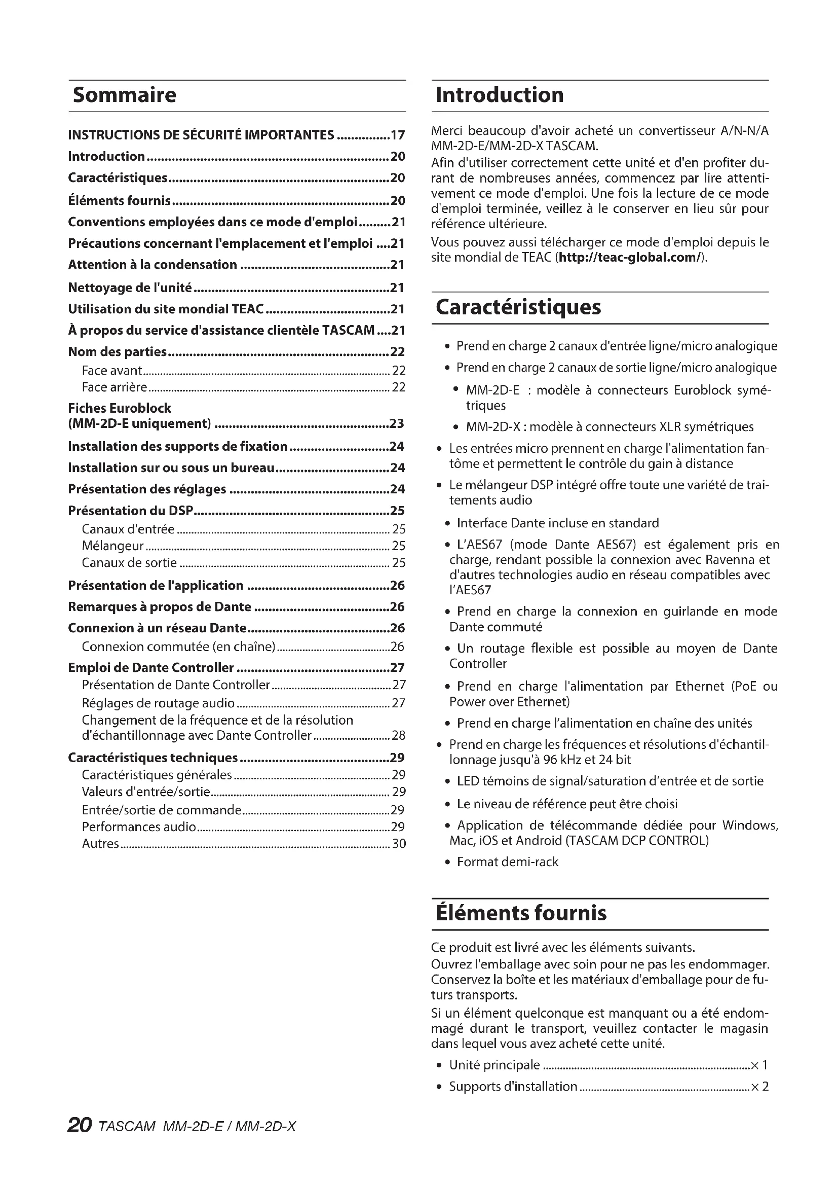 MM-2D-X: modèle à connecteurs XLR symétriques i Les entrées micro prennent en charge l'alimentation fan- tôme et permettent le contrôle du gain à distance i Le mélangeur DSP intégré offre toute une variété de trai- tements audio i Interface Dante incluse en standard i L’AES67 (mode Dante AES67) est également pris en charge, rendant possible la connexion avec Ravenna et d'autres technologies audio en réseau compatibles avec l’AES67 i Prend en charge la connexion en guirlande en mode Dante commuté i Un routage flexible est possible au moyen de Dante Controller i Prend en charge l'alimentation par Ethernet (PoE ou Power over Ethernet) i Prend en charge l’alimentation en chaîne des unités i Prend en charge les fréquences et résolutions d'échantil- lonnage jusqu'à 96kHz et 24bit i LED témoins de signal/saturation d’entrée et de sortie i Le niveau de référence peut être choisi i Application de télécommande dédiée pour Windows, Mac, iOS et Android (TASCAM DCP CONTROL) i Format demi-rack Éléments fournis Ce produit est livré avec les éléments suivants. Ouvrez l'emballage avec soin pour ne pas les endommager. Conservez la boîte et les matériaux d'emballage pour de fu- turs transports. Si un élément quelconque est manquant ou a été endom- magé durant le transport, veuillez contacter le magasin dans lequel vous avez acheté cette unité. i Unité principale .........................................................................× 1 i Supports d'installation ............................................................× 2 Sommaire