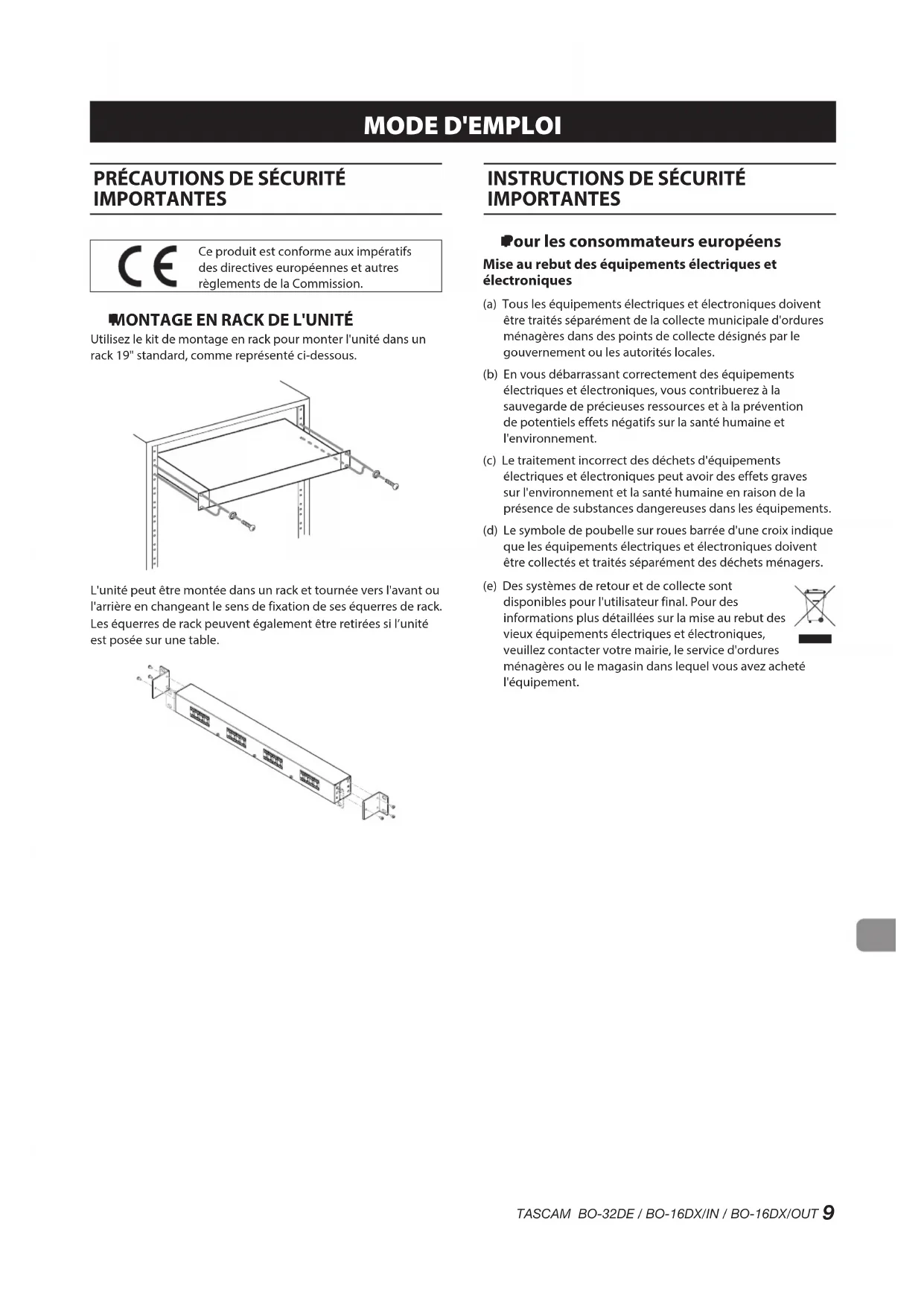 Pour les consommateurs européens Mise au rebut des équipements électriques et électroniques (a) Tous les équipements électriques et électroniques doivent être traités séparément de la collecte municipale d'ordures ménagères dans des points de collecte désignés par le gouvernement ou les autorités locales. (b) En vous débarrassant correctement des équipements électriques et électroniques, vous contribuerez à la sauvegarde de précieuses ressources et à la prévention de potentiels effets négatifs sur la santé humaine et l'environnement. (c) Le traitement incorrect des déchets d'équipements électriques et électroniques peut avoir des effets graves sur l'environnement et la santé humaine en raison de la présence de substances dangereuses dans les équipements. (d) Le symbole de poubelle sur roues barrée d'une croix indique que les équipements électriques et électroniques doivent être collectés et traités séparément des déchets ménagers. (e) Des systèmes de retour et de collecte sont disponibles pour l'utilisateur final. Pour des informations plus détaillées sur la mise au rebut des vieux équipements électriques et électroniques, veuillez contacter votre mairie, le service d'ordures ménagères ou le magasin dans lequel vous avez acheté l'équipement.10 TASCAM BO-32DE / BO-16DX/IN / BO-16DX/OUT Sommaire