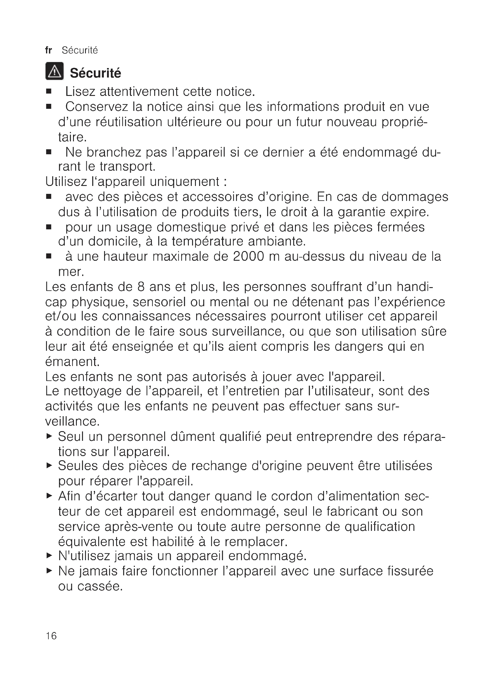 Ne jamais faire fonctionner l’appareil avec une surface fissurée ou cassée.Sécurité fr