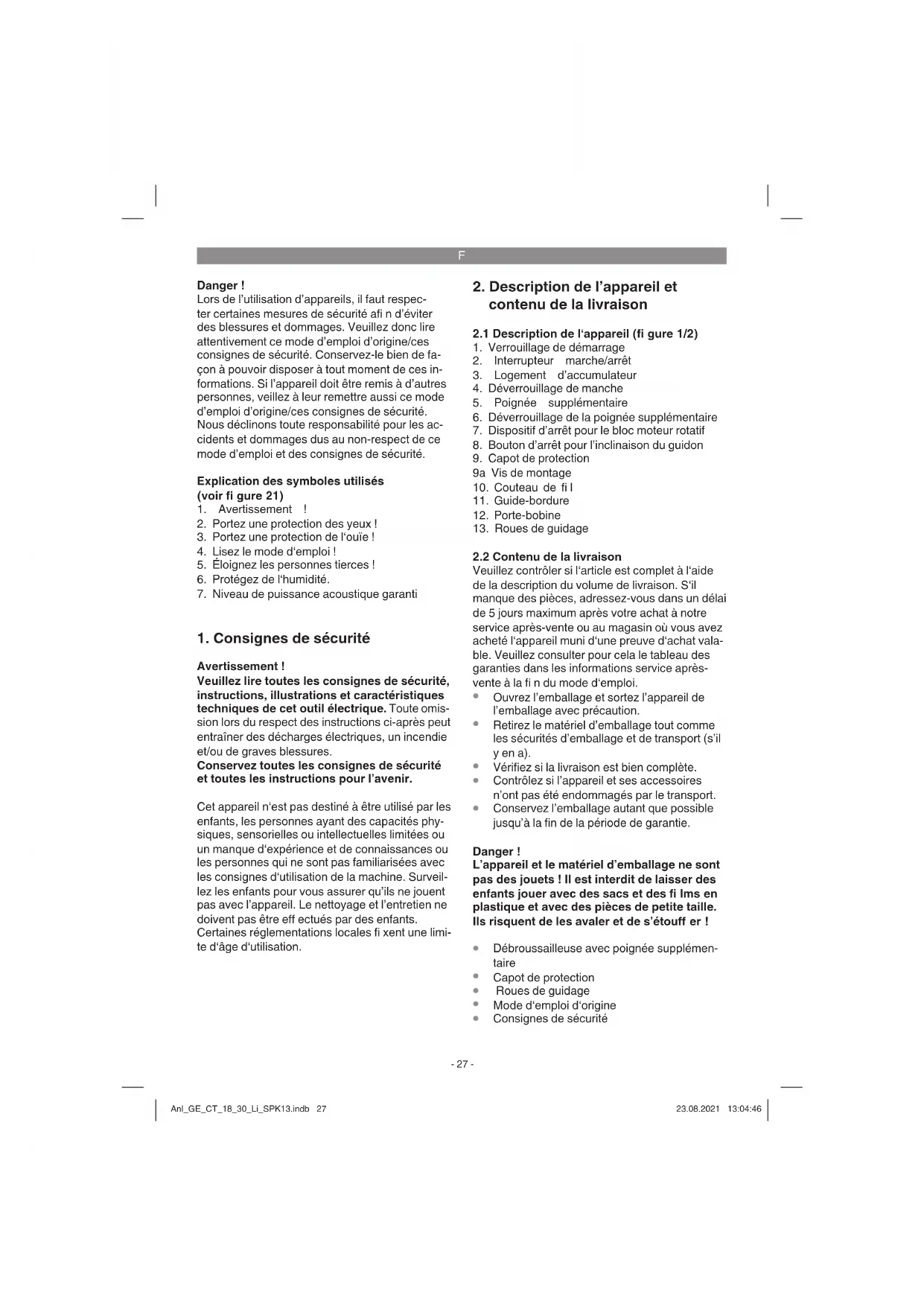 L‘appareil ne fonctionne pas : Vérifi ez que l‘accumulateur est chargé et que le chargeur fonctionne. Dans le cas où l‘appareil ne fonctionne pas alors que la tension est pré- sente, renvoyez celui-ci au service après-vente à l‘adresse indiquée. Anl_GE_CT_18_30_Li_SPK13.indb 32Anl_GE_CT_18_30_Li_SPK13.indb 32 23.08.2021 13:04:4823.08.2021 13:04:48F