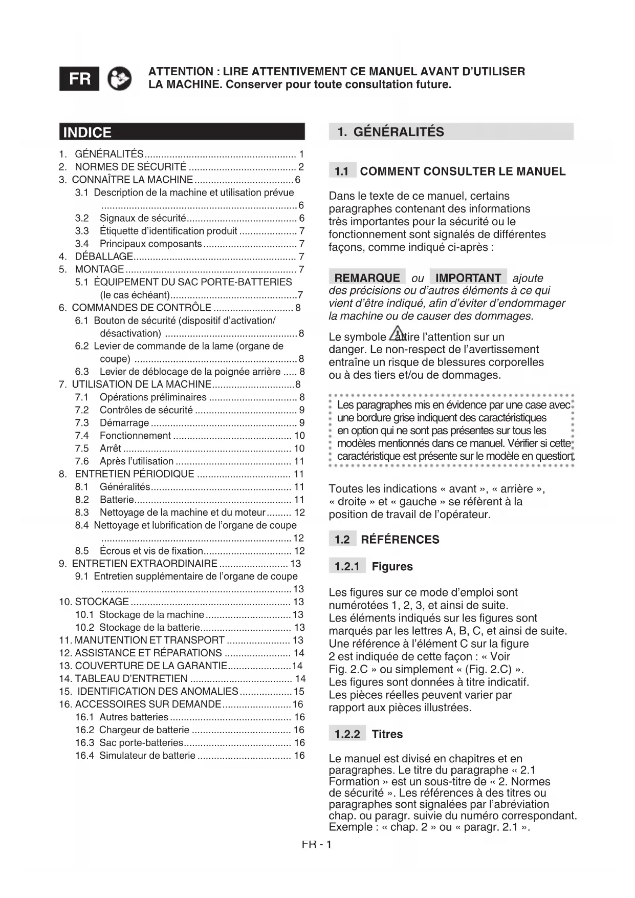 Chaque fois qu’il est nécessaire de déplacer ou de transporter la machine, il faut : – arrêter la machine (paragr. 7.5) ; – Retirer la batterie de son logement et la recharger (paragr. 8.2.2). – Lorsque l’organe de coupe est à l’arrêt, appliquer la protection de la lame. – Porter des gants de travail robustes. – Saisir la machine uniquement par les poignées et orienter l’organe de coupe dans la direction contraire au sens de la marche. Pour transporter la machine avec un véhicule, il faut :FR - 14 – Bien attacher la machine à l’aide de cordes ou de sangles. – La positionner de façon à ce qu’elle ne représente aucun danger.