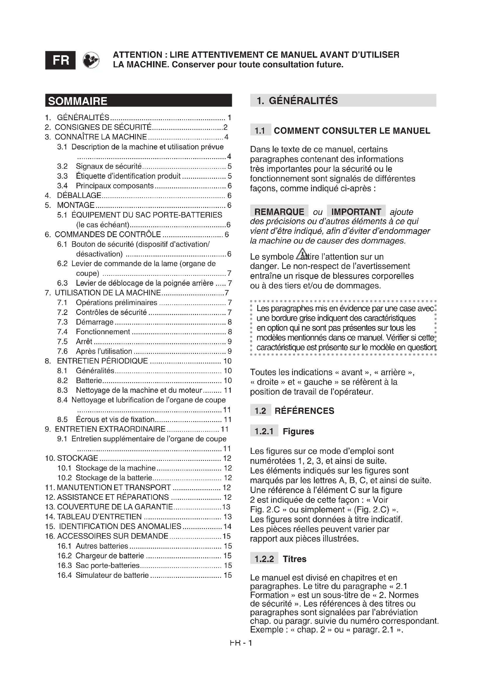 Le manuel est divisé en chapitres et en paragraphes. Le titre du paragraphe « 2.1 Formation » est un sous-titre de « 2. Normes de sécurité ». Les références à des titres ou paragraphes sont signalées par l’abréviation chap. ou paragr. suivie du numéro correspondant. Exemple : « chap. 2 » ou « paragr. 2.1 ». SOMMAIRE