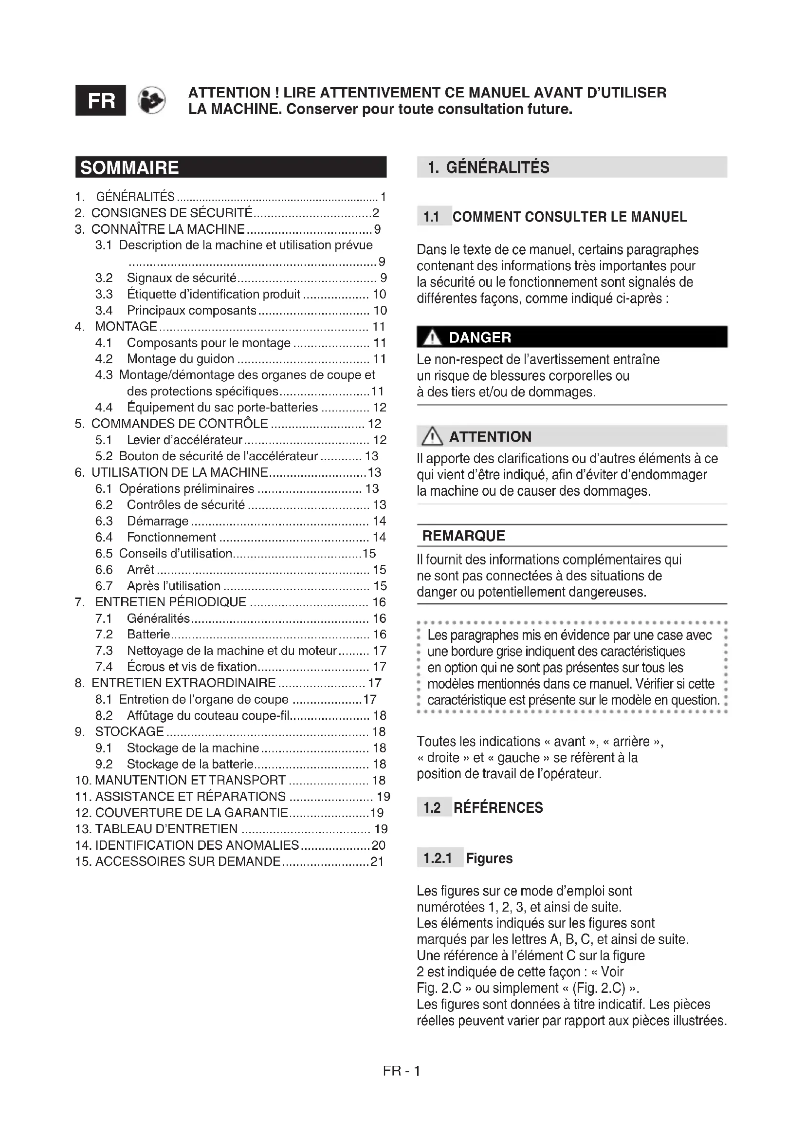 DANGER Se familiariser avec les commandes et avec la bonne utilisation de la machine. Apprendre à arrêter rapidement la machine. Le non- respect des avertissements et des instructions peut causer des incendies et/ou de graves lésions.FR - 4