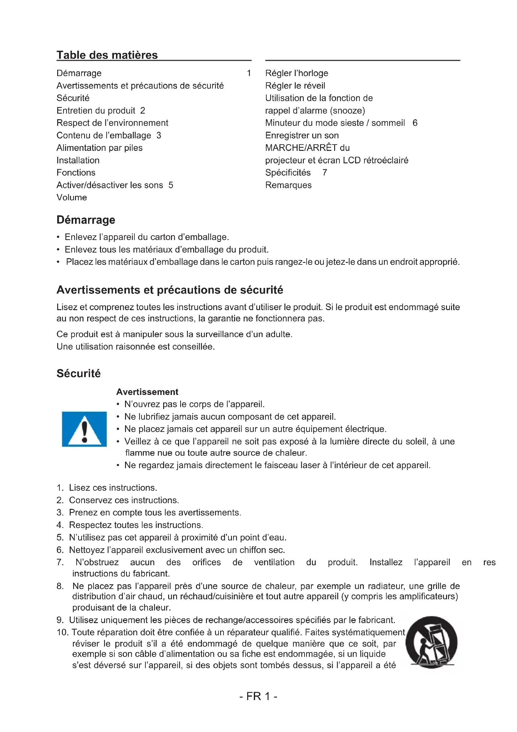 LISEZ COMPLÈTEMENT CE MANUEL D’UTILISATION AVANT D’UTILISER CET APPAREIL ET CONSERVEZ CE LIVRET POUR VOUS Y RÉFÉRER ULTÉRIEUREMENT. FR- FR 1 - Table des matières Démarrage 1 Avertissements et précautions de sécurité Sécurité Entretien du produit 2 Respect de l’environnement Contenu de l’emballage 3 Alimentation par piles Installation Fonctions Activer/désactiver les sons 5 Volume Régler l’horloge Régler le réveil Utilisation de la fonction de rappel d’alarme (snooze) Minuteur du mode sieste / sommeil 6 Enregistrer un son MARCHE/ARRÊT du projecteur et écran LCD rétroéclairé Spécicités 7 Remarques Démarrage