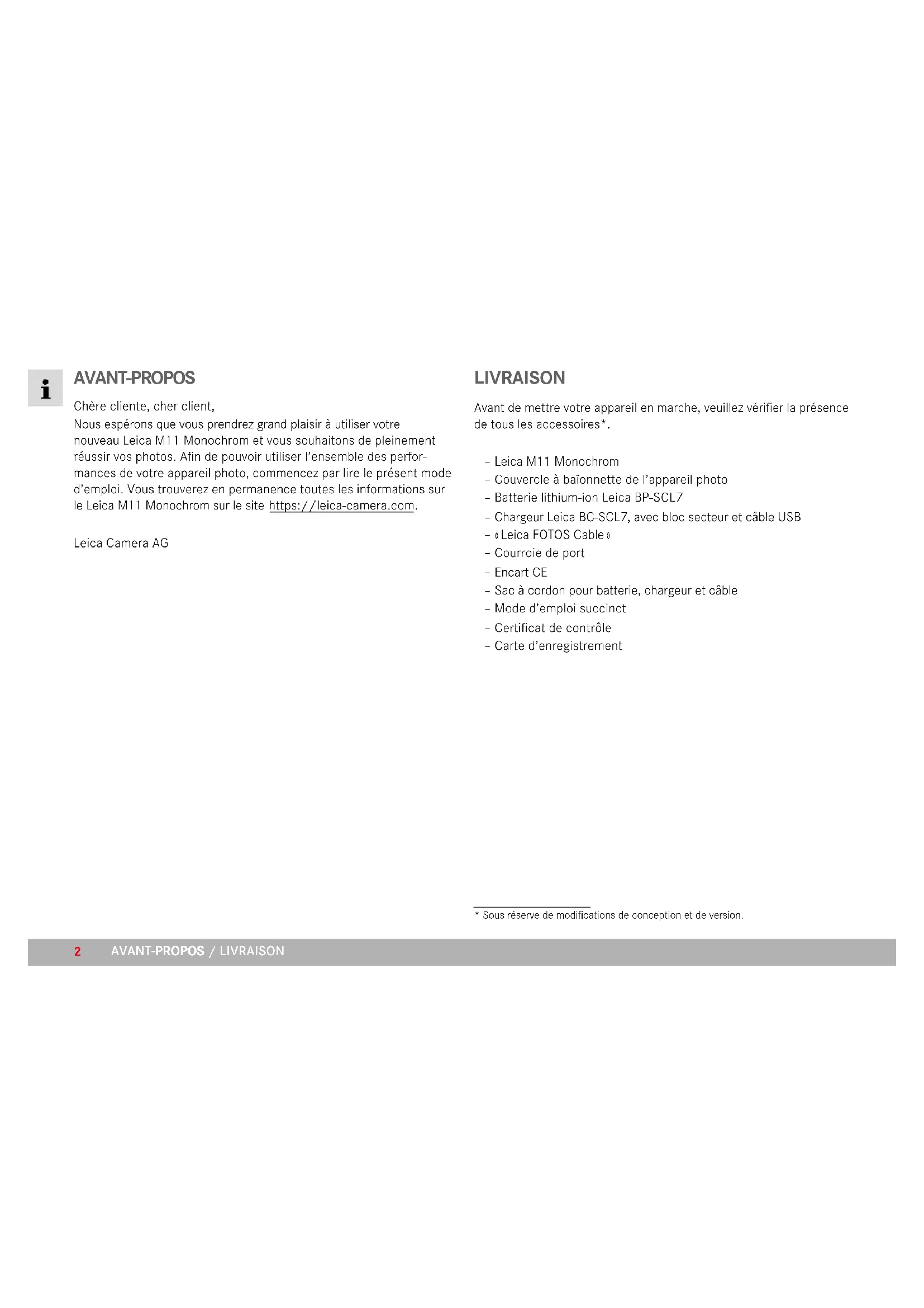 AVANT-PROPOS Chère cliente, cher client, Nous espérons que vous prendrez grand plaisir à utiliser votre nouveau Leica M11 Monochrom et vous souhaitons de pleinement réussir vos photos. Afin de pouvoir utiliser l’ensemble des perfor- mances de votre appareil photo, commencez par lire le présent mode d’emploi. Vous trouverez en permanence toutes les informations sur le Leica M11 Monochrom sur le site https://leica-camera.com. Leica Camera AG LIVRAISON Avant de mettre votre appareil en marche, veuillez vérifier la présence de tous les accessoires*. – Leica M11 Monochrom – Couvercle à baïonnette de l’appareil photo – Batterie lithium-ion Leica BP-SCL7 – Chargeur Leica BC-SCL7, avec bloc secteur et câble USB – « Leica FOTOS Cable » – Courroie de port – Encart CE – Sac à cordon pour batterie, chargeur et câble – Mode d’emploi succinct – Certificat de contrôle – Carte d’enregistrement