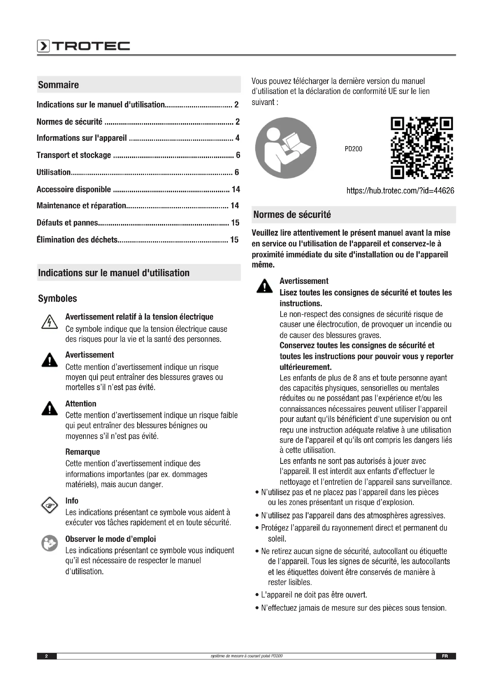 - Élimination des déchets Indications sur le manuel d'utilisation Symboles Avertissement relatif à la tension électrique Ce symbole indique que la tension électrique cause des risques pour la vie et la santé des personnes. Avertissement Cette mention d’avertissement indique un risque moyen qui peut entraîner des blessures graves ou mortelles s’il n’est pas évité. Attention Cette mention d’avertissement indique un risque faible qui peut entraîner des blessures bénignes ou moyennes s’il n’est pas évité. Remarque Cette mention d’avertissement indique des informations importantes (par ex. dommages matériels), mais aucun danger. Info Les indications présentant ce symbole vous aident à exécuter vos tâches rapidement et en toute sécurité. Observer le mode d’emploi Les indications présentant ce symbole vous indiquent qu’il est nécessaire de respecter le manuel d'utilisation. Vous pouvez télécharger la dernière version du manuel d’utilisation et la déclaration de conformité UE sur le lien suivant: PD200 https://hub.trotec.com/?id=44626 Normes de sécurité Veuillez lire attentivement le présent manuel avant la mise en service ou l'utilisation de l'appareil et conservez-le à proximité immédiate du site d'installation ou de l'appareil même. Avertissement Lisez toutes les consignes de sécurité et toutes les instructions. Le non-respect des consignes de sécurité risque de causer une électrocution, de provoquer un incendie ou de causer des blessures graves. Conservez toutes les consignes de sécurité et toutes les instructions pour pouvoir vous y reporter ultérieurement. Les enfants de plus de 8ans et toute personne ayant des capacités physiques, sensorielles ou mentales réduites ou ne possédant pas l'expérience et/ou les connaissances nécessaires peuvent utiliser l'appareil pour autant qu'ils bénéficient d'une supervision ou ont reçu une instruction adéquate relative à une utilisation sure de l'appareil et qu'ils ont compris les dangers liés à cette utilisation. Les enfants ne sont pas autorisés à jouer avec l'appareil. Il est interdit aux enfants d'effectuer le nettoyage et l'entretien de l’appareil sans surveillance. p. 15