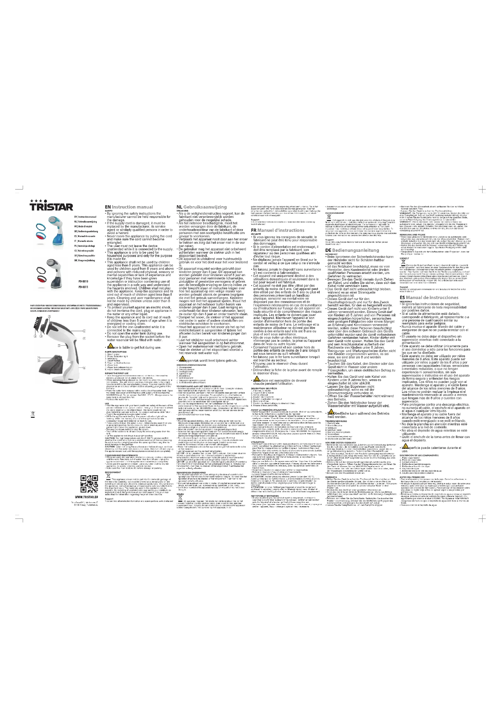 - La surface est susceptible de devenir chaude pendant l'utilisation. DESCRIPTION DES PIÈCES1. Panneau à vapeur2. Voyant d'alimentation3. Corps principal4. Bouton Marche/Arrêt5. Bouton d'activation de vapeur6. Réservoir d'eau7. Bouton de déverrouillage du réservoir d'eau8. Brosse à tissu (amovible)AVANT LA PREMIÈRE UTILISATION• Sortez l'appareil et les accessoires de leur boîte. Retirez les autocollants,la feuille de protection ou le plastique de l'appareil.• Lors du premier usage de l'appareil, laissez la vapeur en marchequelques minutes. Vous éliminez ainsi les impuretés et les odeurs quiont pu demeurer après le processus de fabrication. Vous pouvezsouhaiter essayer le vaporiseur sur un vieil échantillon de tissu avant lavaporisation de votre premier vêtement.• Appuyez sur le bouton de libération de réservoir d'eau et tirez leréservoir d'eau pour le sortir. Ouvrez le couvercle d'entrée d'eau etremplissez le réservoir d'eau jusqu'au niveau MAXIMUM. Ne dépassezjamais niveau MAXIMUM. Assurez-vous toujours que le réservoir d'eauest au moins au tiers plein.• Remettez le réservoir d'eau.UTILISATION• Maintenez l'appareil avec votre main positionnée en toute sécurité sur lecol du vaporiseur de vêtement en position verticale. Utilisez l'autre mainpour fixer la brosse à tissu sur la tête à vapeur. La brosse à tissu peutêtre fixée d'un côté comme de l'autre et s'enclenche avec un clic audible.• Branchez l'appareil sur une prise mise à la terre.• Pendant le chauffage de l'appareil, le témoin d'alimentation clignote. Dèsque le témoin cesse de clignoter et reste allumé, le vaporiseur devêtement est prêt à l'emploi.• Appuyez sur le bouton de vapeur sans relâcher. Vaporisez à la verticaledans la direction opposée à votre corps. Pressez doucement la brosse àtissu contre le vêtement et effectuez avec l'appareil un va-et-vient dehaut en bas.• Relâchez le bouton de vapeur pour arrêter la vaporisation.• Retirez le réservoir d'eau et videz-en l'eau restante.• Laissez l'appareil refroidir à la verticale.ATTENTION : les températures élevées peuvent atteindre 180 ºC.Assurez-vous que la matière résiste aux températures élevées avant del'exposer à la vapeur. Ne laissez pas le panneau de pulvérisation aumême endroit pendant trop longtemps pour éviter d'endommager levêtement.ATTENTION : si vous n'utilisez pas l'appareil et avant le rangement,continuez à vaporiser jusqu'à vider le réservoir de son eau. Arrêtez etdébranchez ensuite l'appareil et attendez qu'il refroidisse complètement.NETTOYAGE ET ENTRETIEN• Si vous n'utilisez pas l'appareil et avant le rangement, continuez àvaporiser jusqu'à vider le réservoir de son eau. Arrêtez et débranchezensuite l'appareil et attendez qu'il refroidisse complètement.• Ne placez pas l'appareil dans l'eau. Utilisez un chiffon sec et propre poursécher l'appareil, Aucun détergent spécial n'est nécessaire.• Assurez-vous que le bloc principal est sec avant son rangement ou sonemballage.ENVIRONNEMENTCet appareil ne doit pas être jeté avec les déchets ménagers à lafin de sa durée de vie, il doit être remis à un centre de recyclage pour lesappareils électriques et électroniques. Ce symbole sur l'appareil, lemanuel d'utilisation et l'emballage attire votre attention sur un pointimportant. Les matériaux utilisés dans cet appareil sont recyclables. Enrecyclant vos appareils, vous contribuez de manière significative à laprotection de notre environnement. Renseignez-vous auprès des autoritéslocales pour connaître les centres de collecte des déchets.SupportVous retrouvez toutes les informations et pièces de rechange surwww.tristar.eu! DEBedienungsanleitung SICHERHEIT