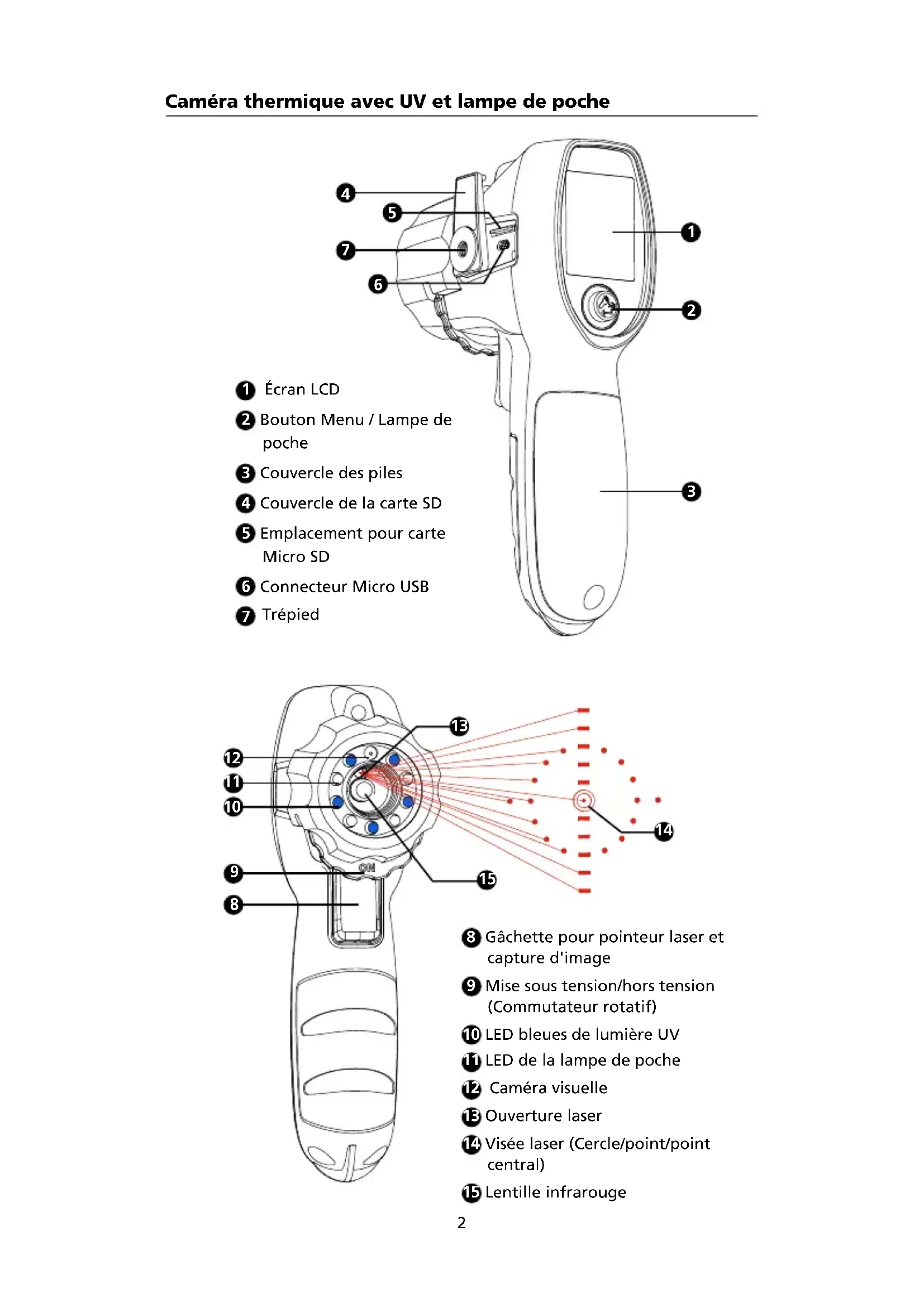 - 5 en 1: lumière UV, lampe de poche, température infrarouge, image thermique et pointeur laser