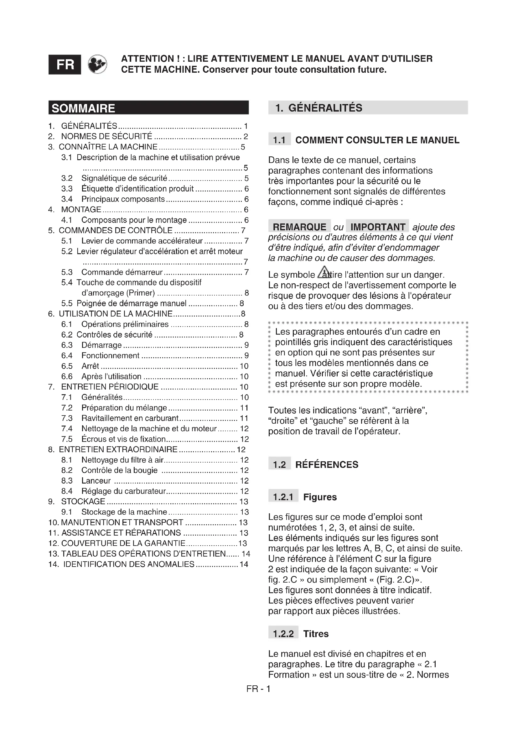 Intervention Périodicité Paragraphe MACHINE Contrôle de toutes les xations Avant chaque utilisation 7.5 Contrôles de sécurité / Vérication des commandes Avant chaque utilisation 6.2 Nettoyage général et contrôle À la n de chaque utilisation 7.4 MOTEUR Contrôle/appoint du niveau de carburant Avant chaque utilisation 7.3 Nettoyage général et contrôle À la n de chaque utilisation 7.4 Nettoyage du ltre à air 8-10 heures / après chaque saison