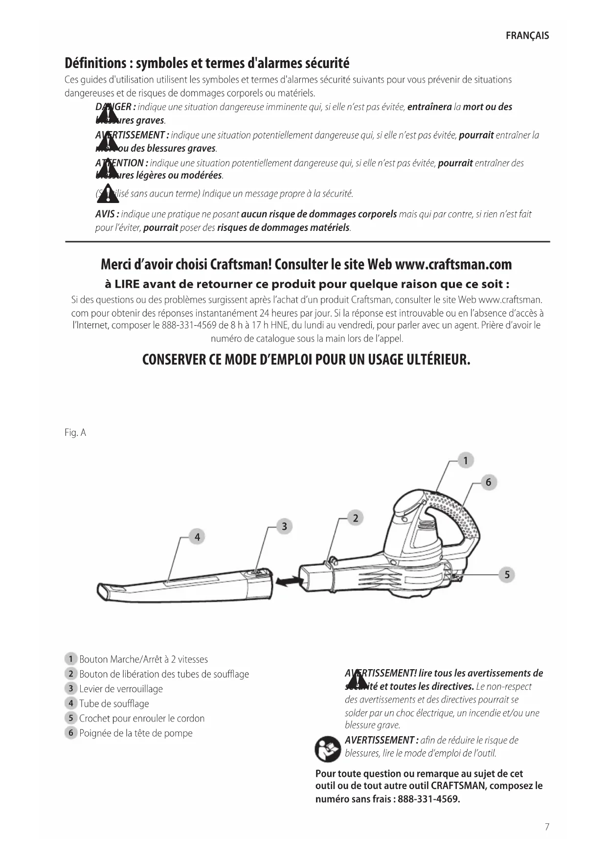 blessures, lire le mode d’emploi del’outil. Pour toute question ou remarque au sujet de cet outil ou de tout autre outil CRAFTSMAN, composez le numéro sans frais : 888-331-4569. Français (traduction de la notice d’instructions originale) Fig. A