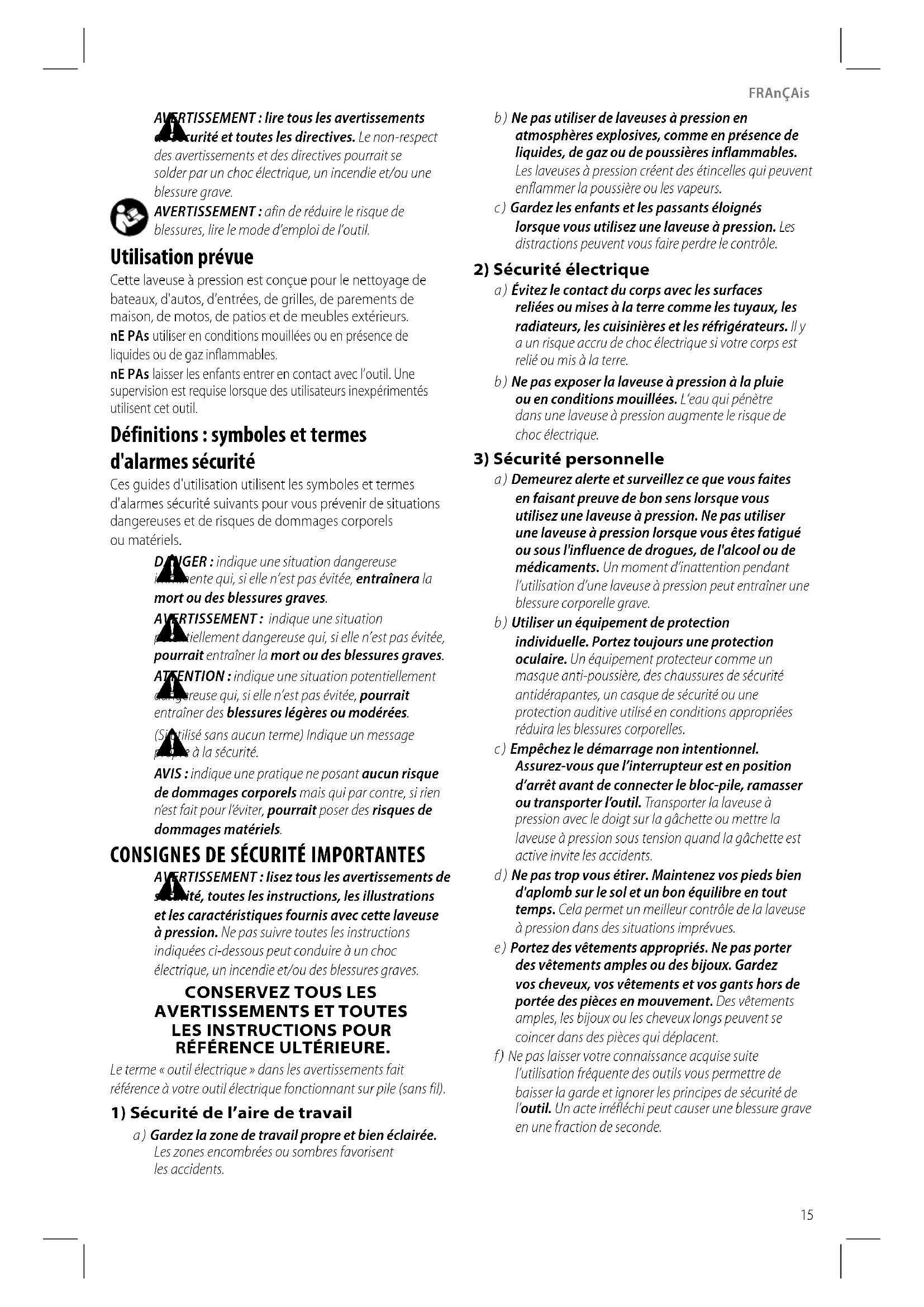 piles a ) Rechargez seulement avec le chargeur indiqué par le fabricant. Un chargeur est approprié pour un type de bloc‑piles et peut créer un risque d’incendie s’il est utilisé avec un bloc‑piles d'un autretype. b ) Utilisez des laveuses à pression seulement avec des blocs‑piles spécialement conçus. Utiliser d'autres blocs‑piles peut créer un risque de blessure oud’incendie. c ) Lorsque vous n’utilisez pas le bloc‑piles, gardez‑le hors de portée d’autres objets métalliques, comme les trombones, les pièces de monnaie, les clés, les clous, les vis et autres petits objets métalliques qui peuvent connecter une borne à une autre. Faire un court‑circuit entre les bornes des piles peut entraîner des brûlures ou unincendie. d ) En conditions abusives, du liquide peut être éjecté de la pile; évitez le contact. Si un contact se produit accidentellement, rincez avec de l’eau. Si du liquide entre en contact avec les yeux,FRAnçAis