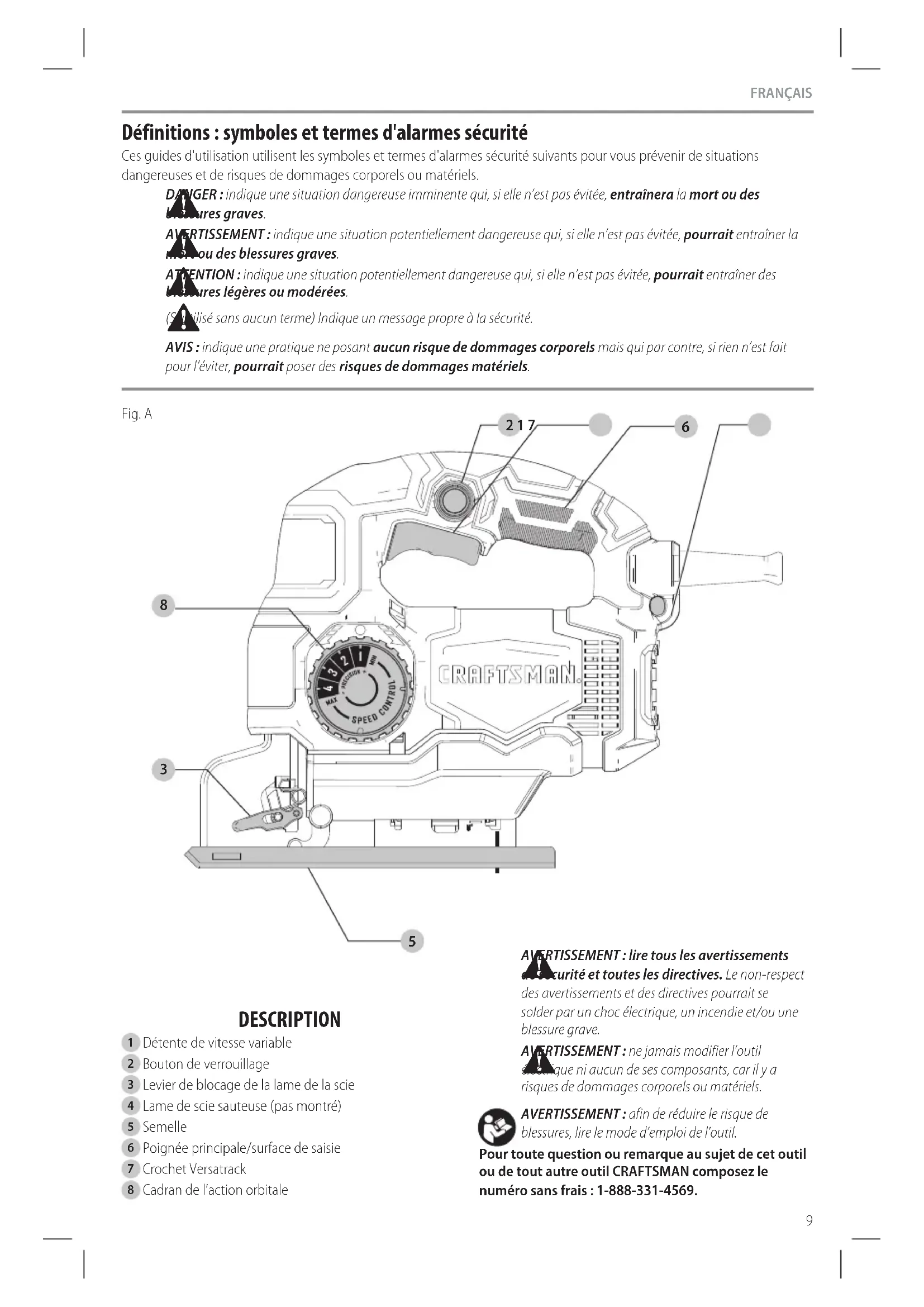 blessures, lire le mode d’emploi del’outil. Pour toute question ou remarque au sujet de cet outil ou de tout autre outil CRAFTSMAN composez le numéro sans frais : 1-888-331-4569.