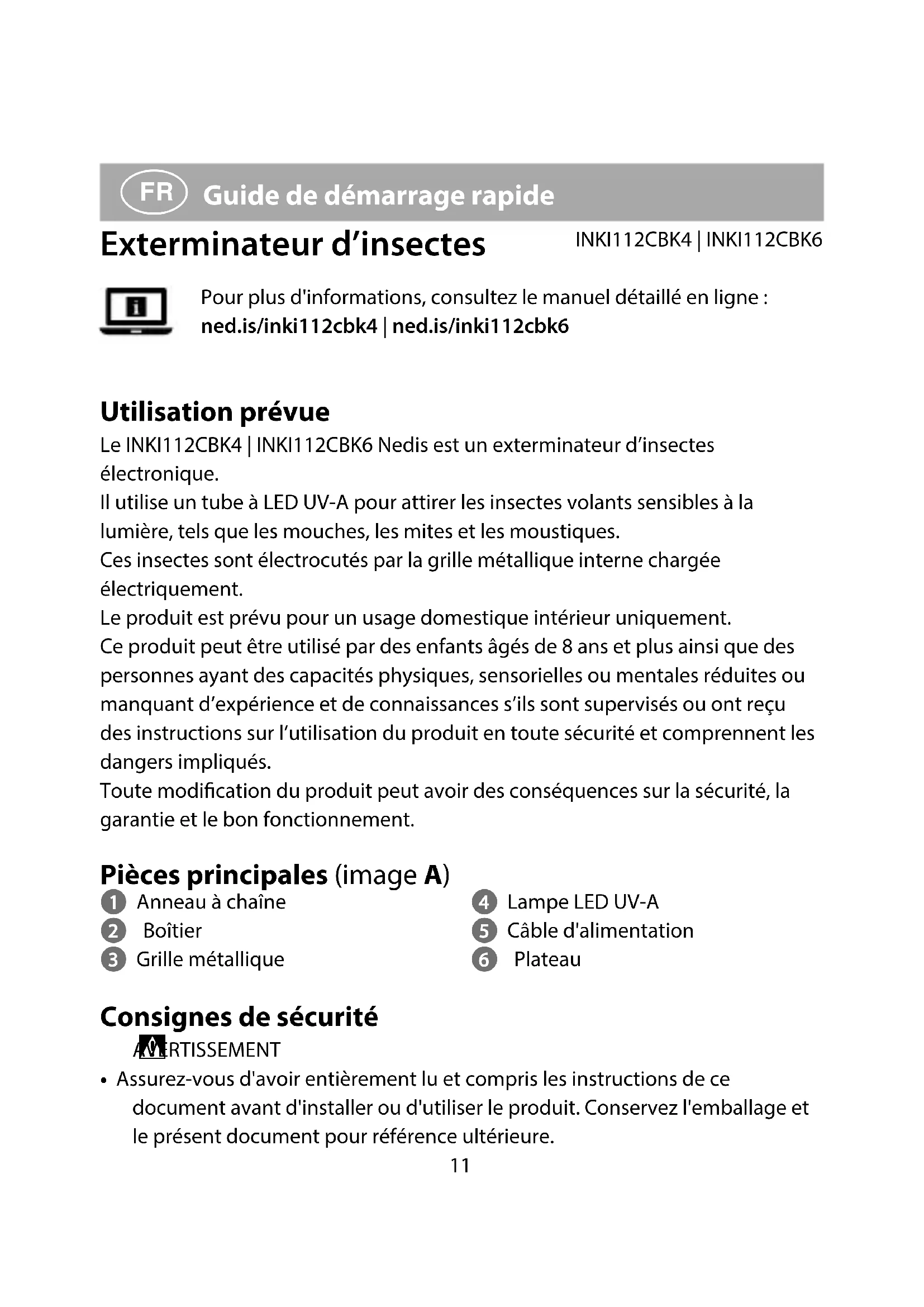 Guide de démarrage rapide Exterminateur d’insectes INKI112CBK4 | INKI112CBK6Pour plus d'informations, consultez le manuel détaillé en ligne : ned.is/inki112cbk4 | ned.is/inki112cbk6 Utilisation prévue Le INKI112CBK4 | INKI112CBK6 Nedis est un exterminateur d’insectes électronique.Il utilise un tube à LED UV-A pour attirer les insectes volants sensibles à la lumière, tels que les mouches, les mites et les moustiques.Ces insectes sont électrocutés par la grille métallique interne chargée électriquement.Le produit est prévu pour un usage domestique intérieur uniquement.Ce produit peut être utilisé par des enfants âgés de 8 ans et plus ainsi que des personnes ayant des capacités physiques, sensorielles ou mentales réduites ou manquant d’expérience et de connaissances s’ils sont supervisés ou ont reçu des instructions sur l’utilisation du produit en toute sécurité et comprennent les dangers impliqués.Toute modication du produit peut avoir des conséquences sur la sécurité, la garantie et le bon fonctionnement. Pièces principales (image A) 1 Anneau à chaîne 2 Boîtier 3 Grille métallique 4 Lampe LED UV-A 5 Câble d'alimentation 6 Plateau Consignes de sécurité